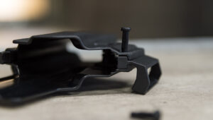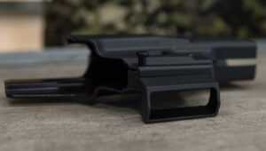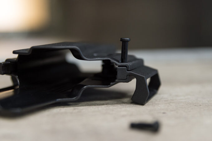 I tu pojawia się rozwiązanie, na które każdy może wpaść. Ale nikt inny nie wpadł. Oprócz kabury w opakowaniu znajdują się bowiem trzy różne montaże. O nich za moment. Istotne jest to, że dzięki tworzywowym kołeczkom użytkownik jest w stanie w ciągu sekund zmienić kaburę IWB – czyli przeznaczoną do skrytego noszenia w spodniach np. w popularnym i chwalonym appendix carry – w kaburę zewnętrzną OWB noszoną na pasku na widoku. Sam proces jest banalnie prosty: wybijamy palcem po jednym pinie z każdej strony kabury. Konieczny do tej czynności nacisk pozwala mieć pewność, że kołki nie wysuną się same. Teraz możemy wymienić montaż wyciągając go w górę, a następnie nowy wsunąć w szczeliny na krawędziach kabury. Nowy montaż zabezpieczamy kołeczkami i gotowe. Rzecz genialna w swej prostocie.
