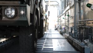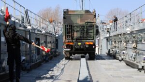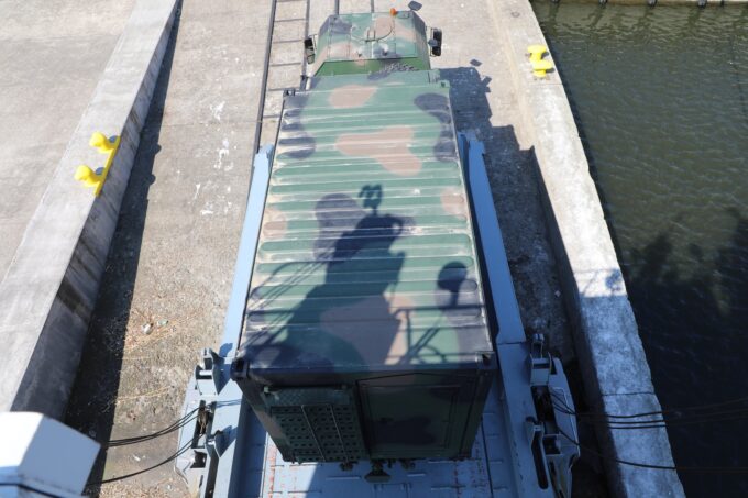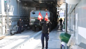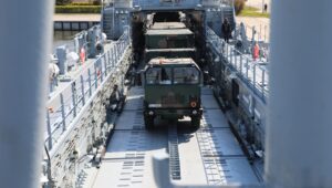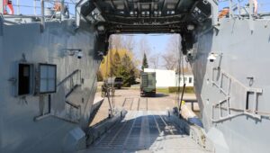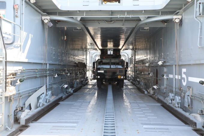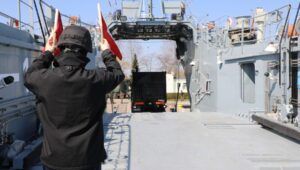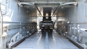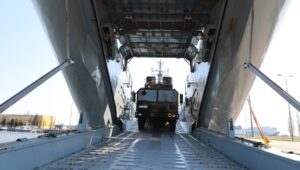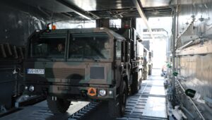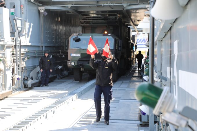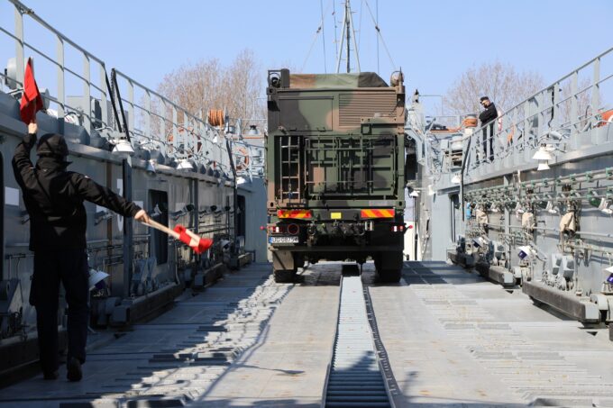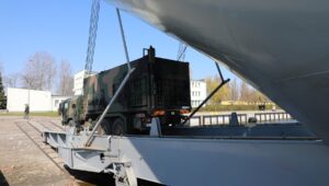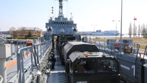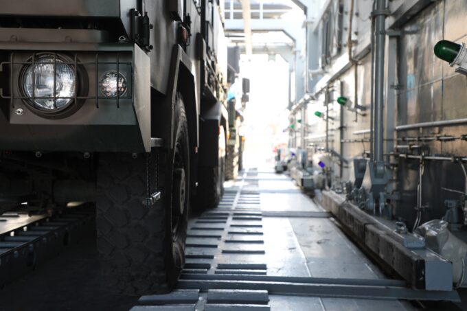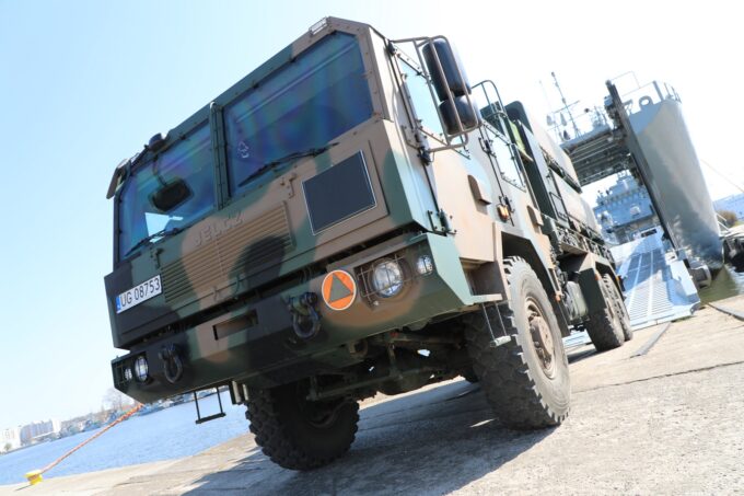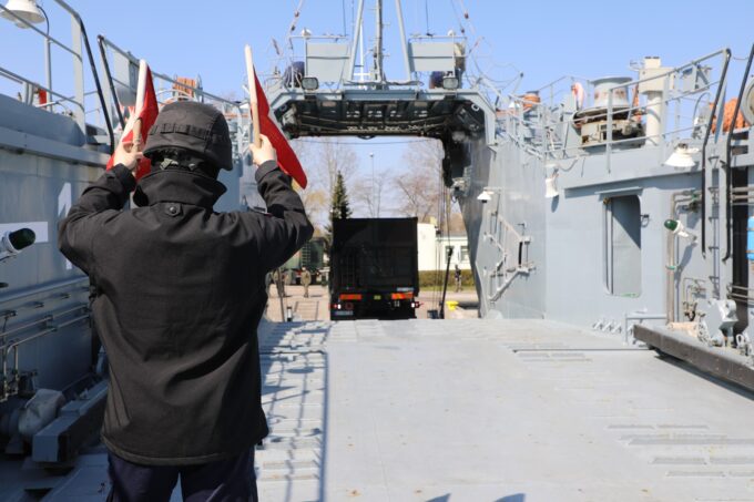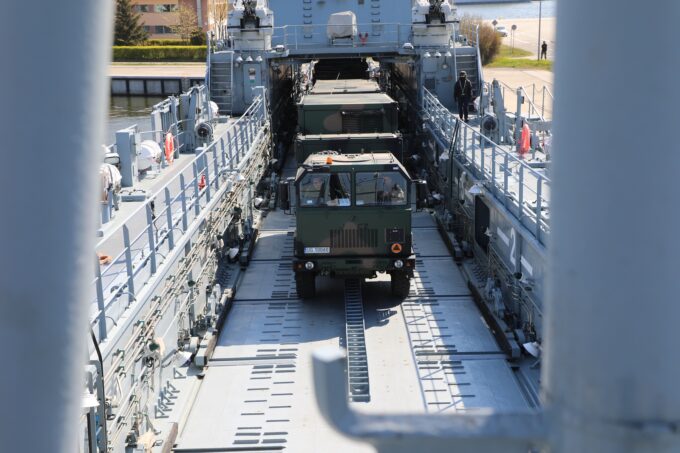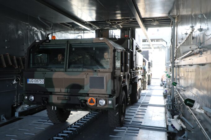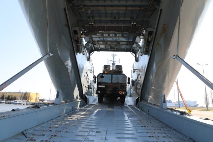 Na pokład okrętu załadowano wozy kierowania środkami walki CCV, dowodzenia SCV i ruchome węzły łączności MCV oraz mobilne wyrzutnie MLV pocisków przeciwokrętowych NSM / Zdjęcia: 8. FOW