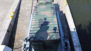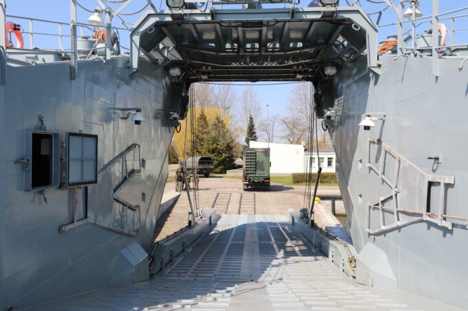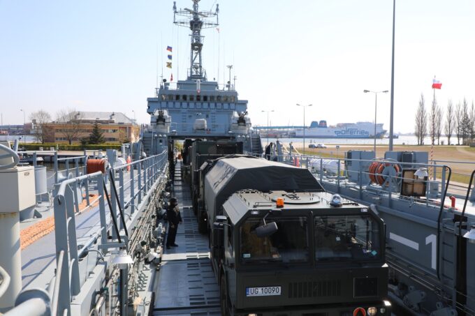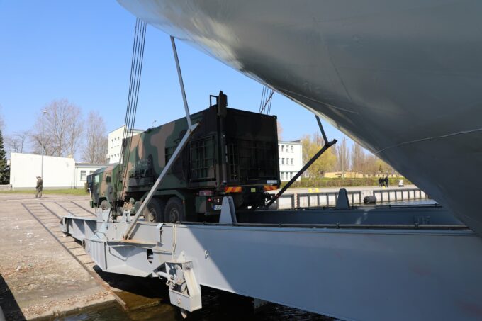 W Porcie Wojennym Świnoujście przećwiczono załadunek elementów modułu bojowego Morskiej Jednostki Rakietowej z Siemirowic na pokład okrętu transportowo-minowego ORP Kraków (823)
