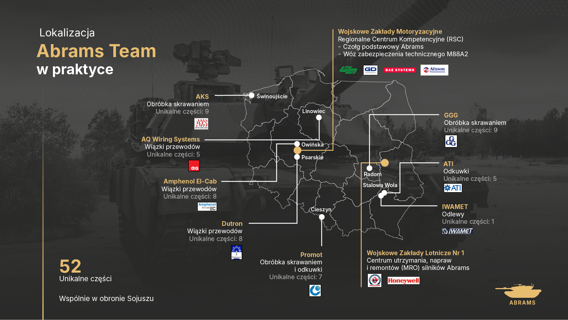 Lokalizacja polskich partnerów zaangażowanych obecnie w produkcję części do czołgów Abrams / Ilustracja: GDLS