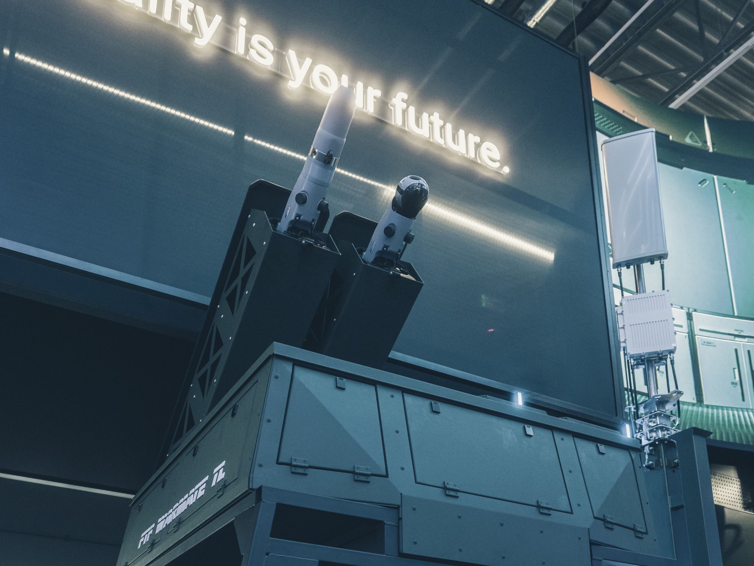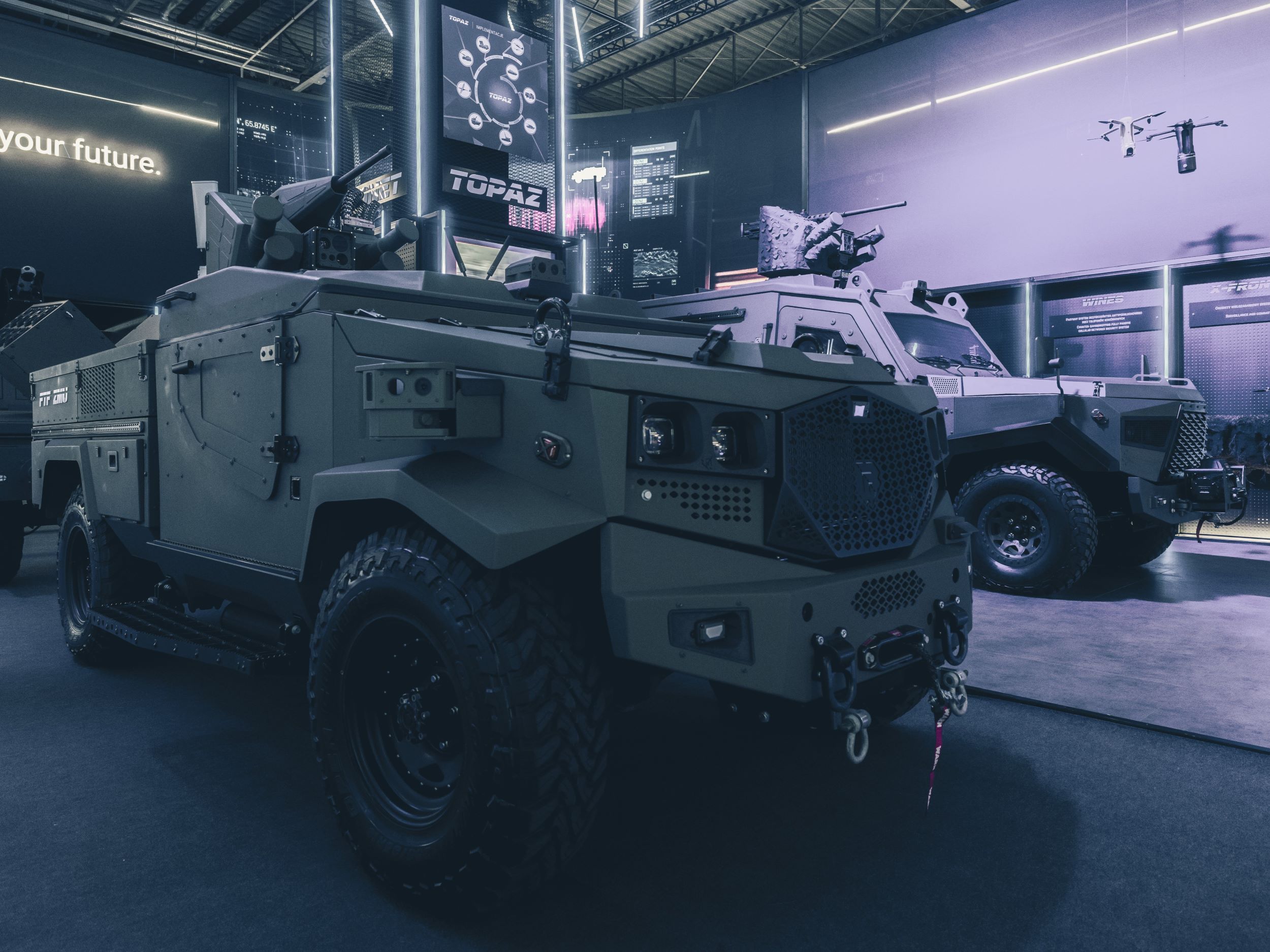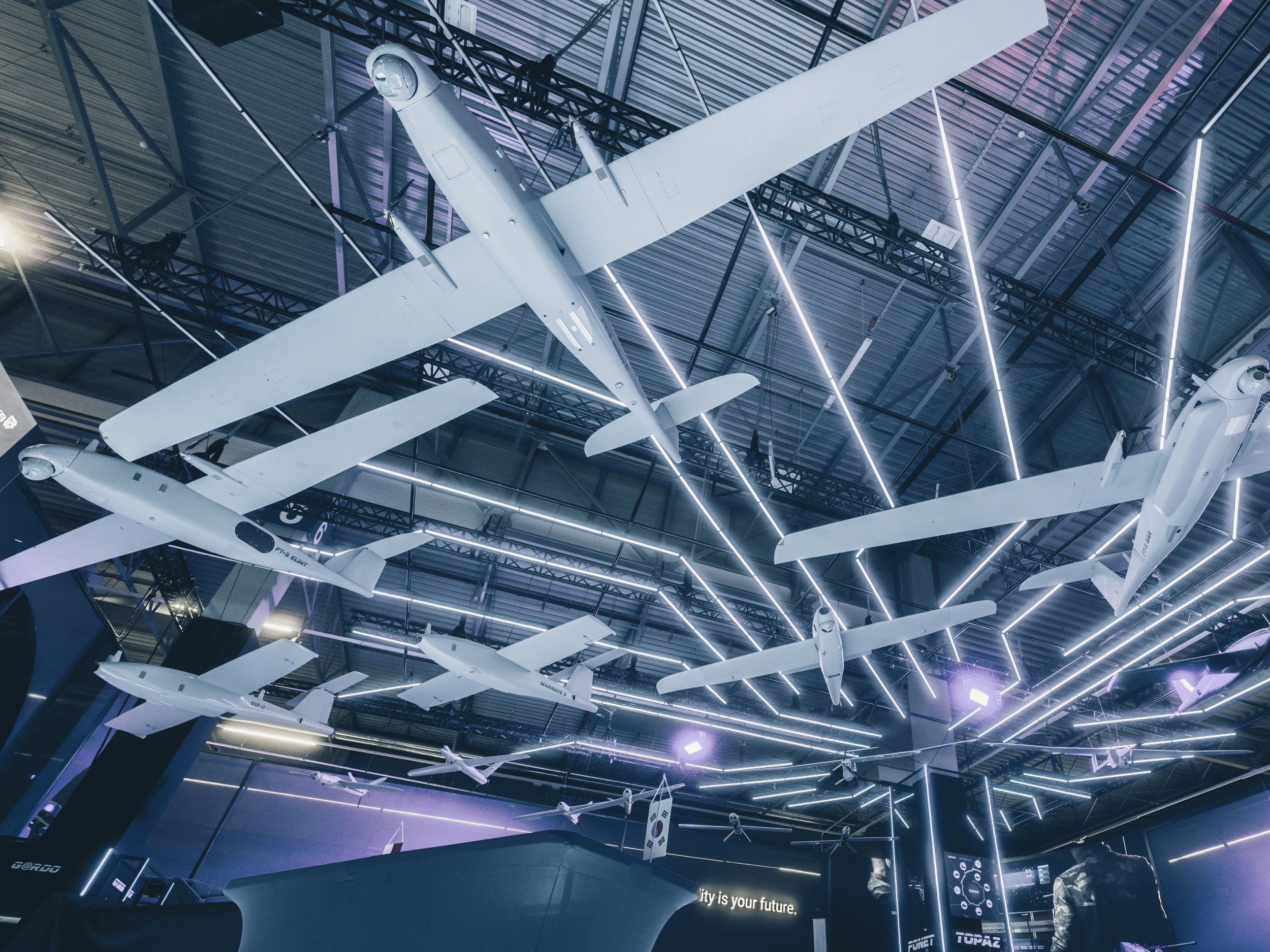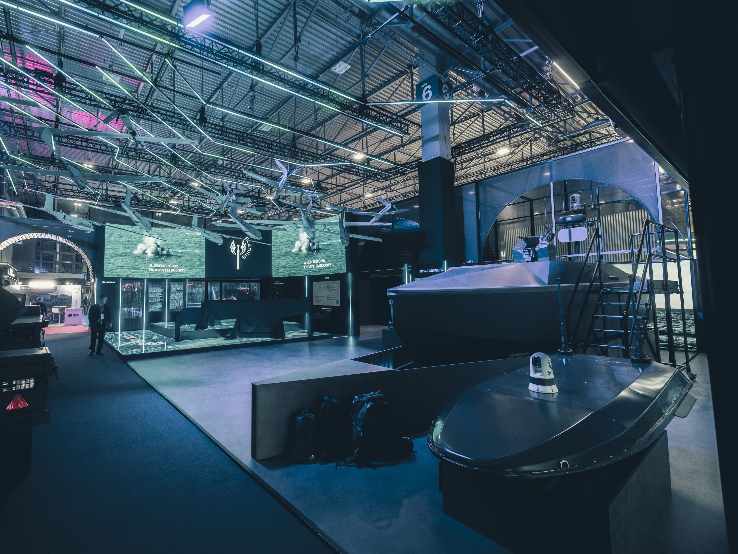 Centralnym elementem pawilonu był podest z paneli LED, na których wyświetlane były filmy prezentujące bezzałogowce powietrzne, podwieszone nad głowami odwiedzających. Całość tworzyła spektakularne widowisko – grę świateł, barw i wizualizacji – które zmieniały ekspozycję w opowieść o przyszłości wielodomenowego pola walki.