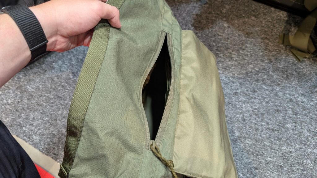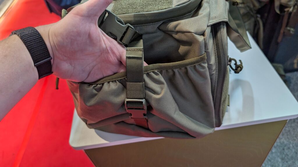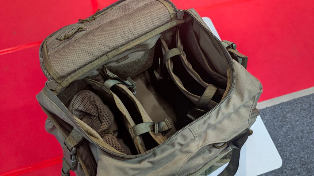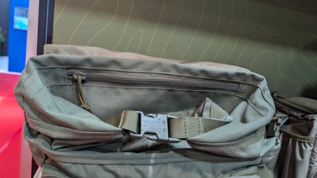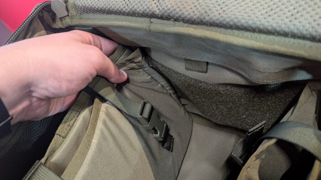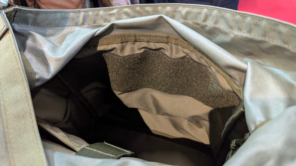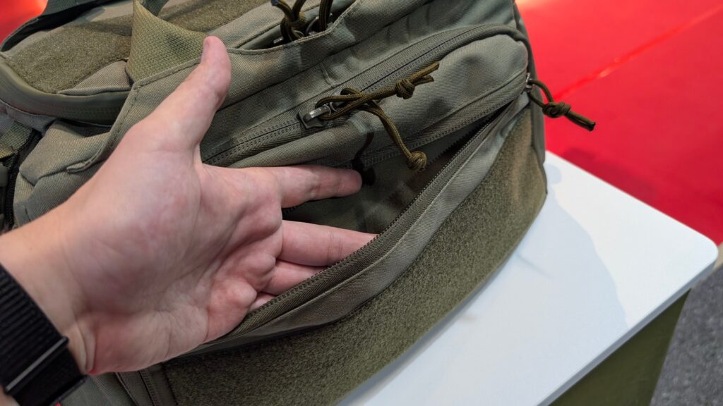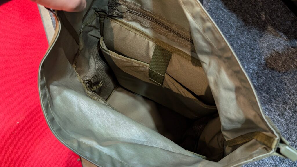 Po drugie – modułowe wnętrze. Dłuższe ścianki oraz spód komory głównej zagospodarowano rzepem, który umożliwia przymocowanie wszelkiego rodzaju kieszeni i organizerów. W zestawie z torbą znajdą się dwie kieszenie na broń krótką. W finalnym produkcie ich wysokość prawdopodobnie ulegnie zredukowaniu, aby w komorze głównej zmieścił się jeszcze pas strzelecki.