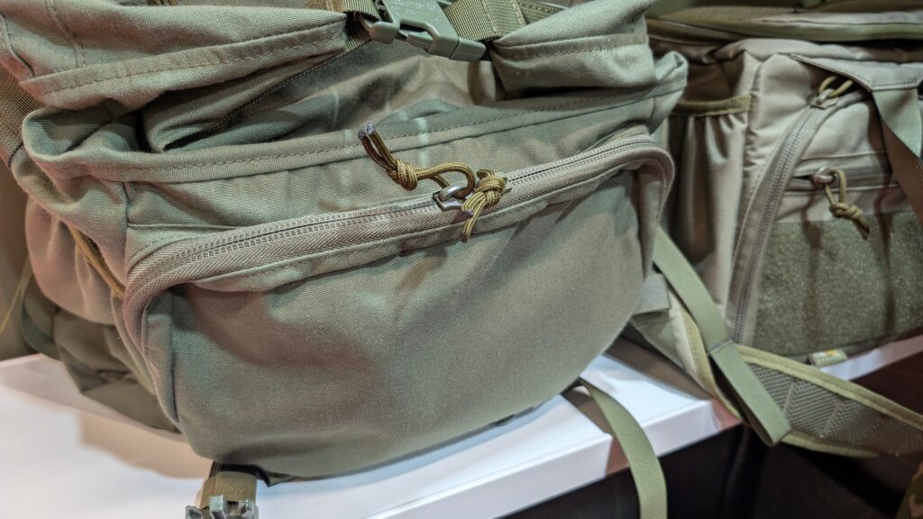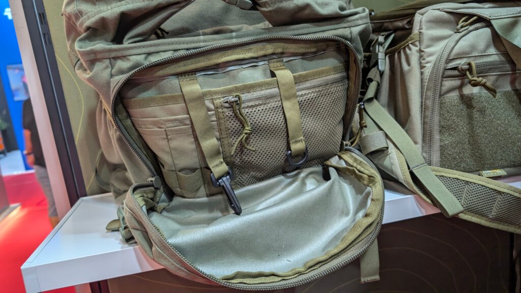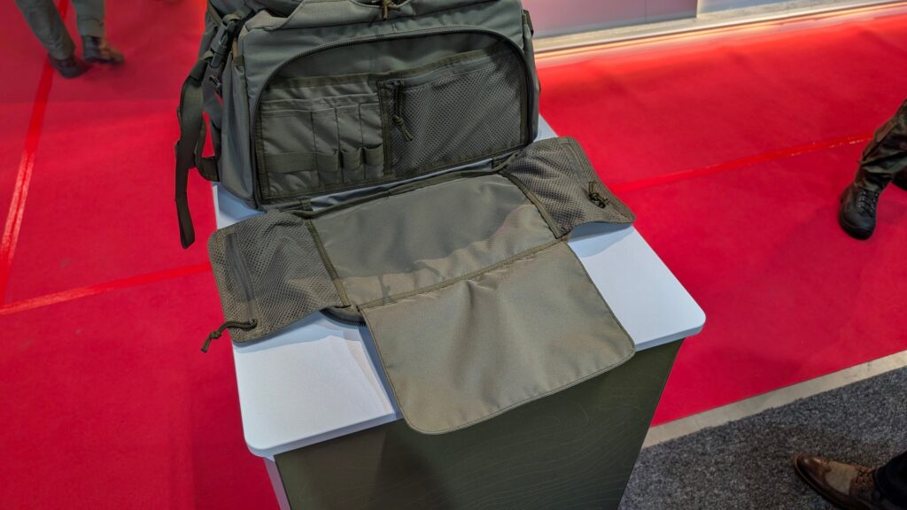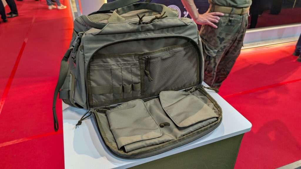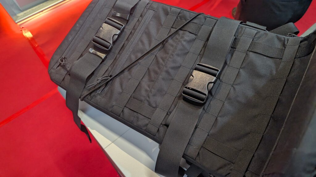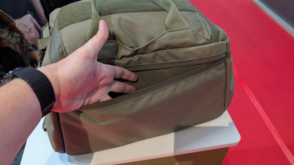 Kolejnym prezentowanym prototypem była z pozoru klasyczna torba na strzelnicę. Podobnych rozwiązań jest już trochę na rynku i nie widzę większego sensu opisywania całej torby – uchwyty transportowe, komora główna, zewnętrzne organizery. Jest jednak kilka charakterystycznych cech, które warto wyróżnić.