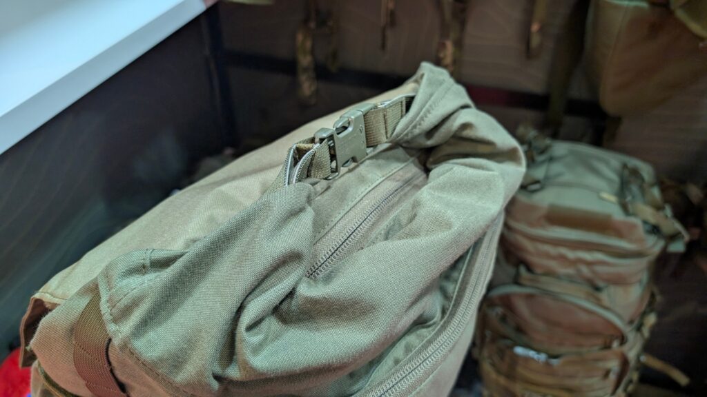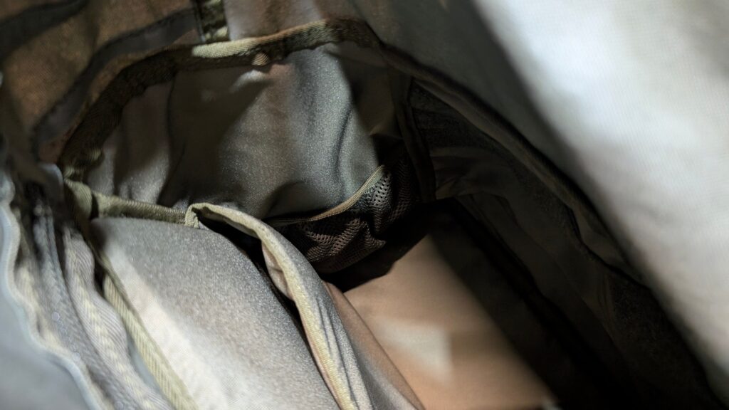 Po otwarciu klapy ukazują nam się znaczne względem pierwowzoru różnice. Komora główna to w zasadzie worek z zamknięciem typu roll top z możliwością szybkiego dostępu za pośrednictwem zamka błyskawicznego.