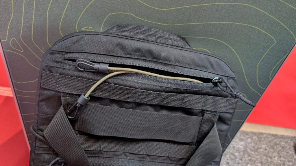 Po pierwsze – przednia kieszeń-organizer stanowi jednocześnie matę do rozkładania broni lub innych akcesoriów, Po otwarciu ukazują się trzy panele do rozłożenia, które w połączeniu z klapą tworzą całkiem sporą powierzchnię w kształcie litery T, przy czym boczne panele to jednocześnie siatkowe kieszonki na zamek. Ciekawe rozwiązanie, które z pewnością doceniłby każdy w wypadku potrzeby rozkładania broni na strzelnicy. Uwaga, która od razu przyszła mi na myśl – rozkładana mata powinna być w jaskrawym kolorze, kontrastującym z czarnymi elementami broni.