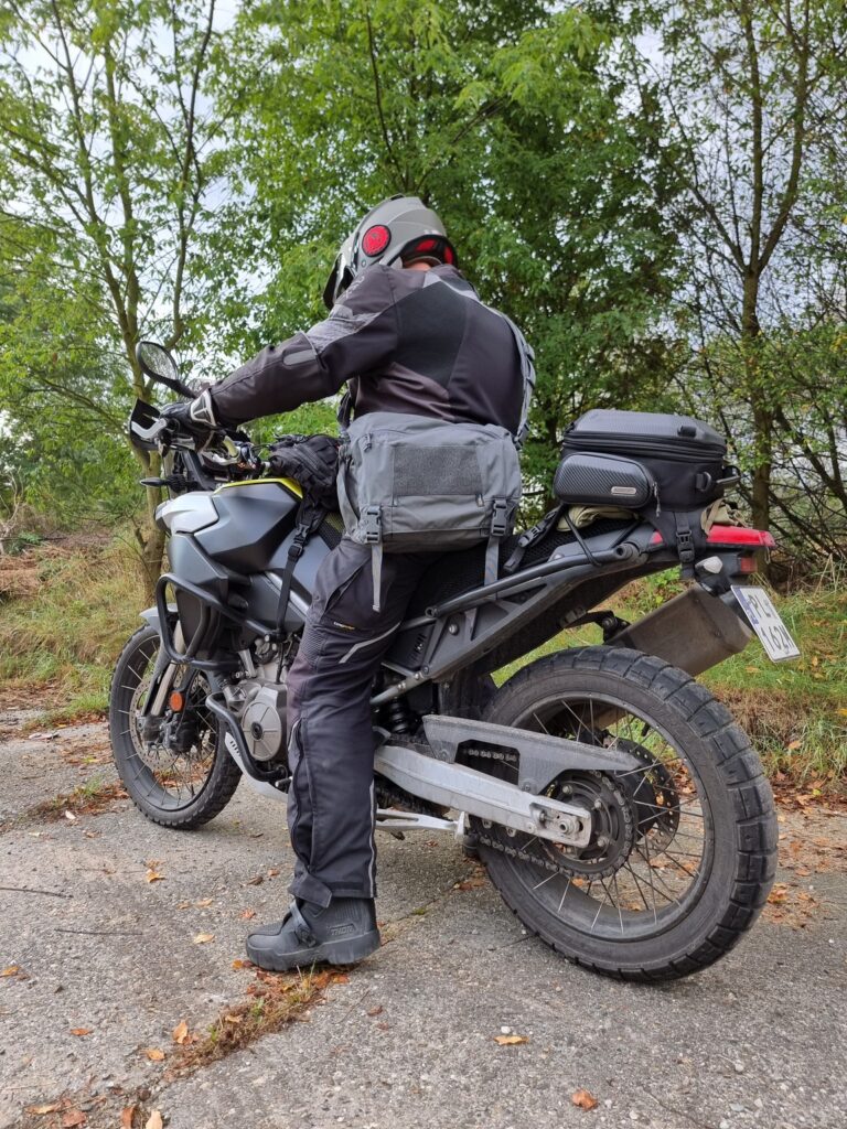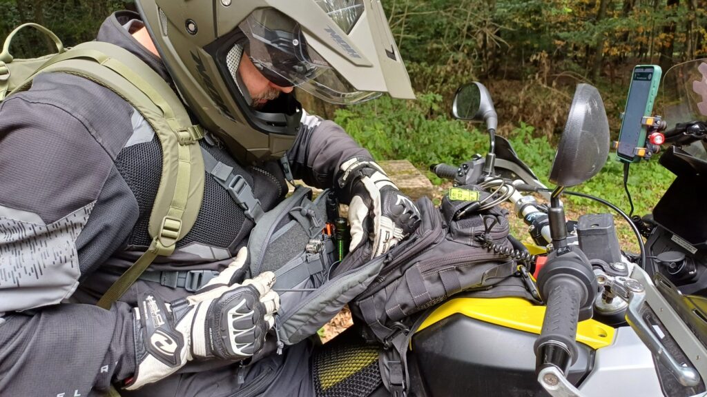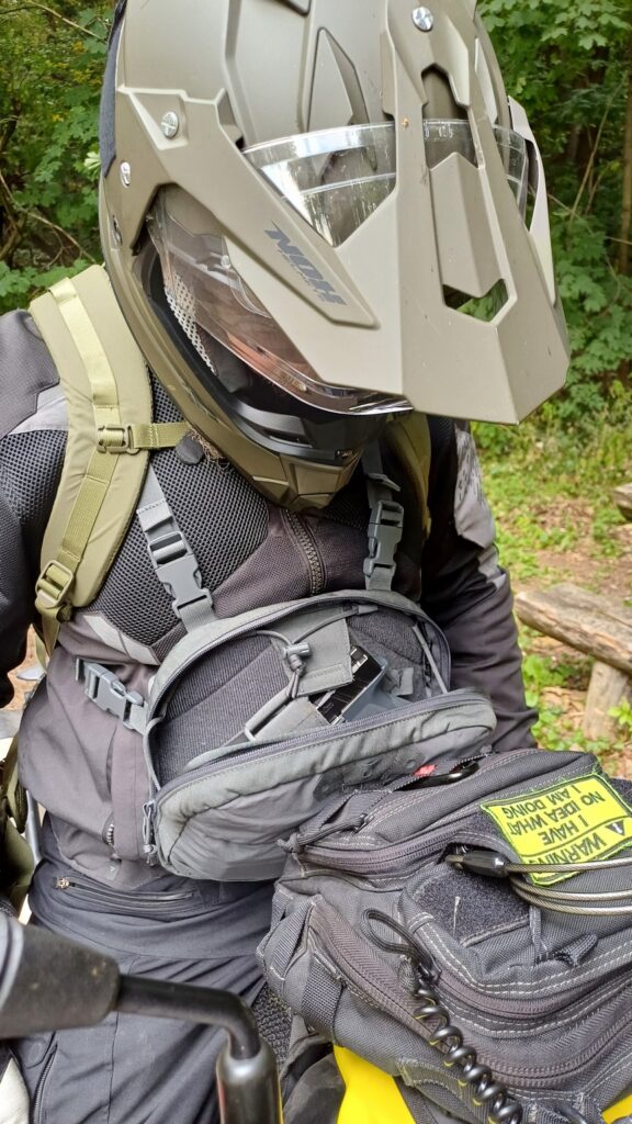 Osobiście często korzystam z tego ostatniego sposobu przemieszczając się na motocyklu. Pozwala mi to przenieść wartościowe przedmioty z kieszeni – co w przypadku jazdy jest nie tylko niewygodne, ale może być niebezpieczne – czy torby zamontowanej na stałe na baku pojazdy w wygodne miejsce, które jednocześnie związane jest nie z kuniem, a z jeźdźcem. Po pierwsze broń (a także dokumenty, portfel, klucze itd…) mam w miejscu łatwo dostępnym, a po drugie zsiadając z motocykla i zostawiając go na parkingu nie mam potrzeby przepakowania całego chabaru, by nie pozostawiać go bez opieki.