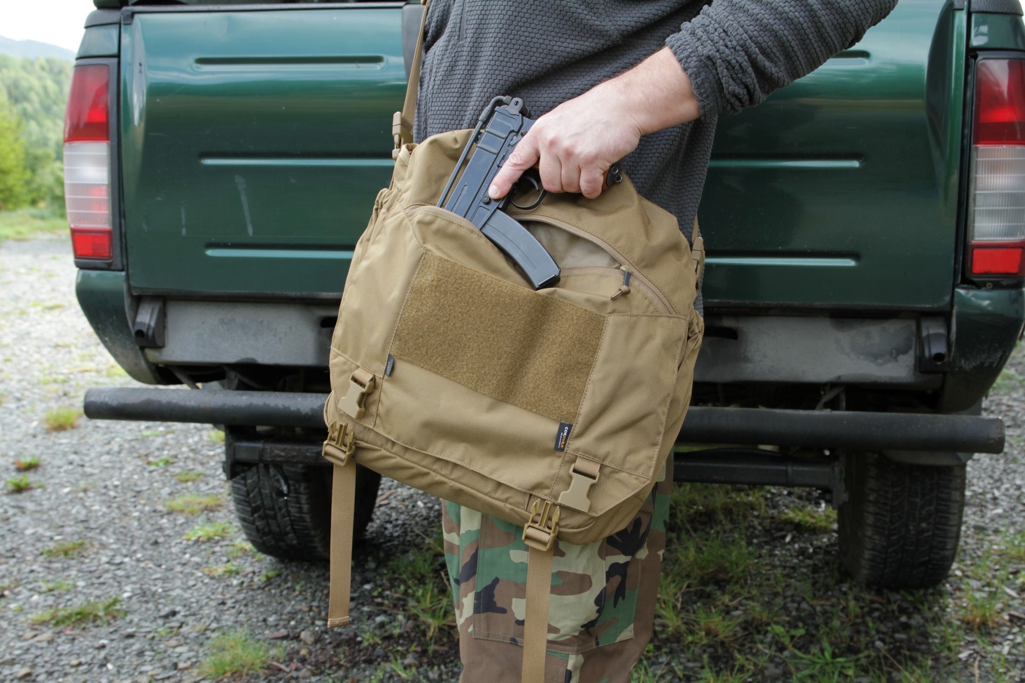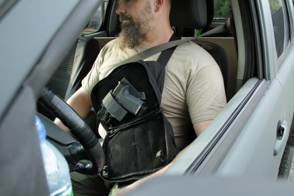 Dobrze dobrany slingbag pozwoli na noszenie zasadniczo dowolnej broni krótkiej, poza wyborami rozsądnymi – jak na załączonym zdjęciu – bez problemu pomieści rewolwer z nawet 8 calową lufą lub odpowiednio skróconą strzelbę 12 Gauge.