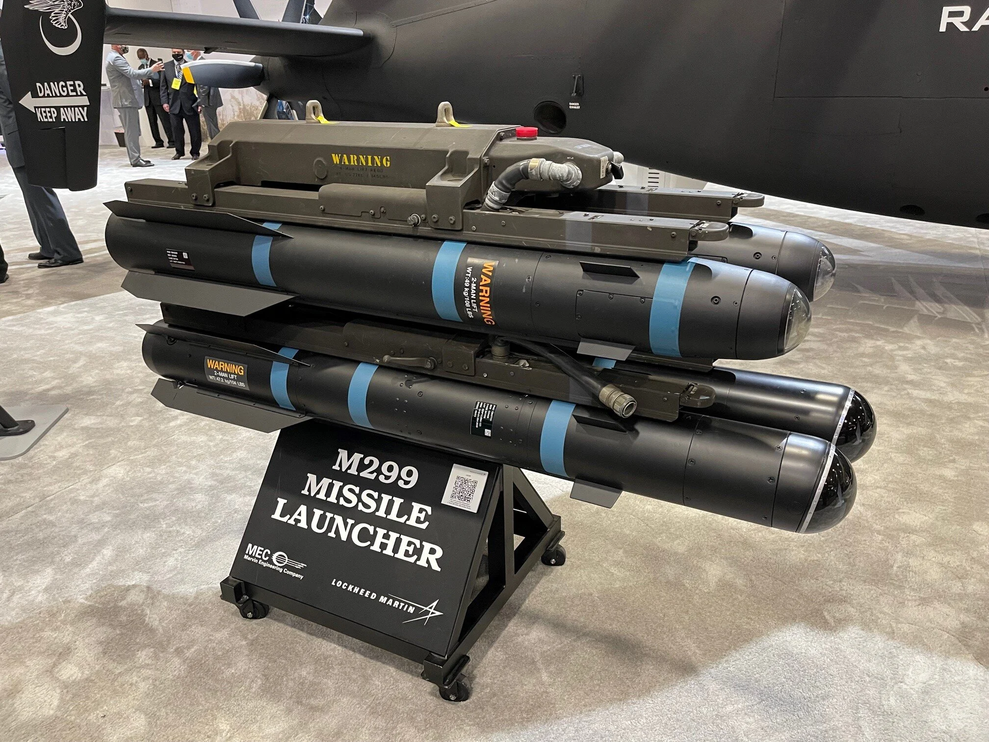 Od góry: starszy AGM-114 Hellfire o długości 163 cm i AGM-179A JAGM na belce uzbrojenia LGMA M299 podczas waszyngtońskiej wystawy sprzętu wojskowego AUSA 2021 / Zdjęcie: CoAspire