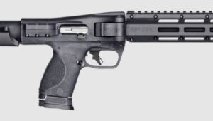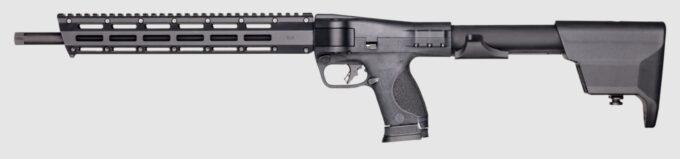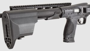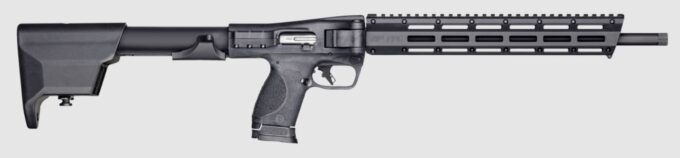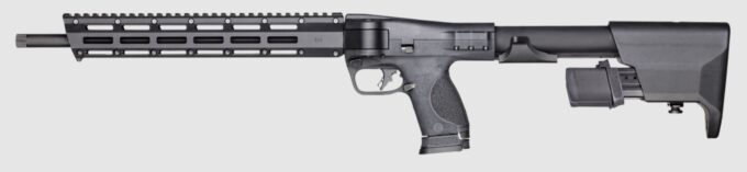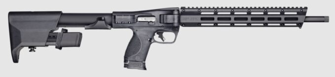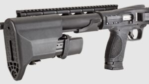 W kolbie znajdują się dwa gniazda na zapasowe magazynki standardu M&P Compact i Full-size. Karabinek dostarczany jest z jednym magazynkiem o pojemności 17 sztuk oraz dwoma o pojemności 23 sztuk.