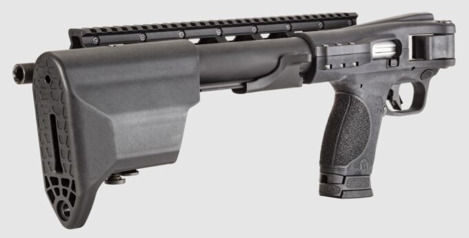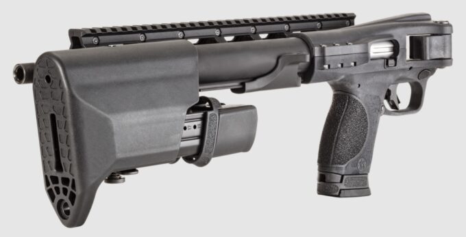 Chwyt pistoletowy naśladuje te z pistoletów M&P i zamontować na nim można okładziny różnych rozmiarów (standardu M&P Compact). Przycisk zwalniacza magazynka znajduje się pod kabłąkiem, tak jak w większości pistoletów. Mechanizm spustowy wyposażony jest w dwa bezpieczniki – wciskowy, znajdujący się nad kabłąkiem (rozwiązanie znane m.in. ze strzelb Mossberg Maverick) oraz bezpiecznik spustowy. Na wysokości okna wyrzutu łusek znajduje się dwustronna dźwignia zatrzasku zamka.