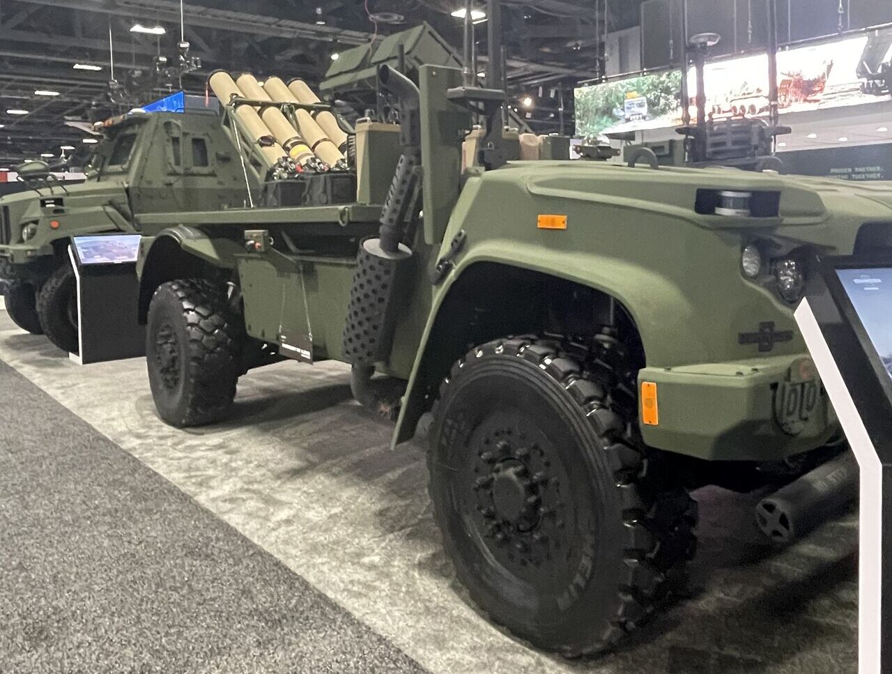 - L-MAV (Light Multi-Mission Autonomous Vehicle) wyewoluowała ze wspomnianej wcześniej bezzałogowej wyrzutni Remotely Operated Ground Unit for Expeditionary (ROGUE) Fires, opartej na podwoziu JLTV (Joint Light Tactical Vehicle), wcześniej w tym roku prezentowanej w konfiguracji na amunicję MLRS MFOM. Teraz, dzięki modułowej konstrukcji, dodano opcje wystrzeliwania amunicji krążącej AeroVironment Switchblade 600, a z platformą zintegrowano system przeciwdronowy BlueHalo Titan C-UAS zakłócający sygnały radiowe i do prowadzenia walki radioelektronicznej (WRE).