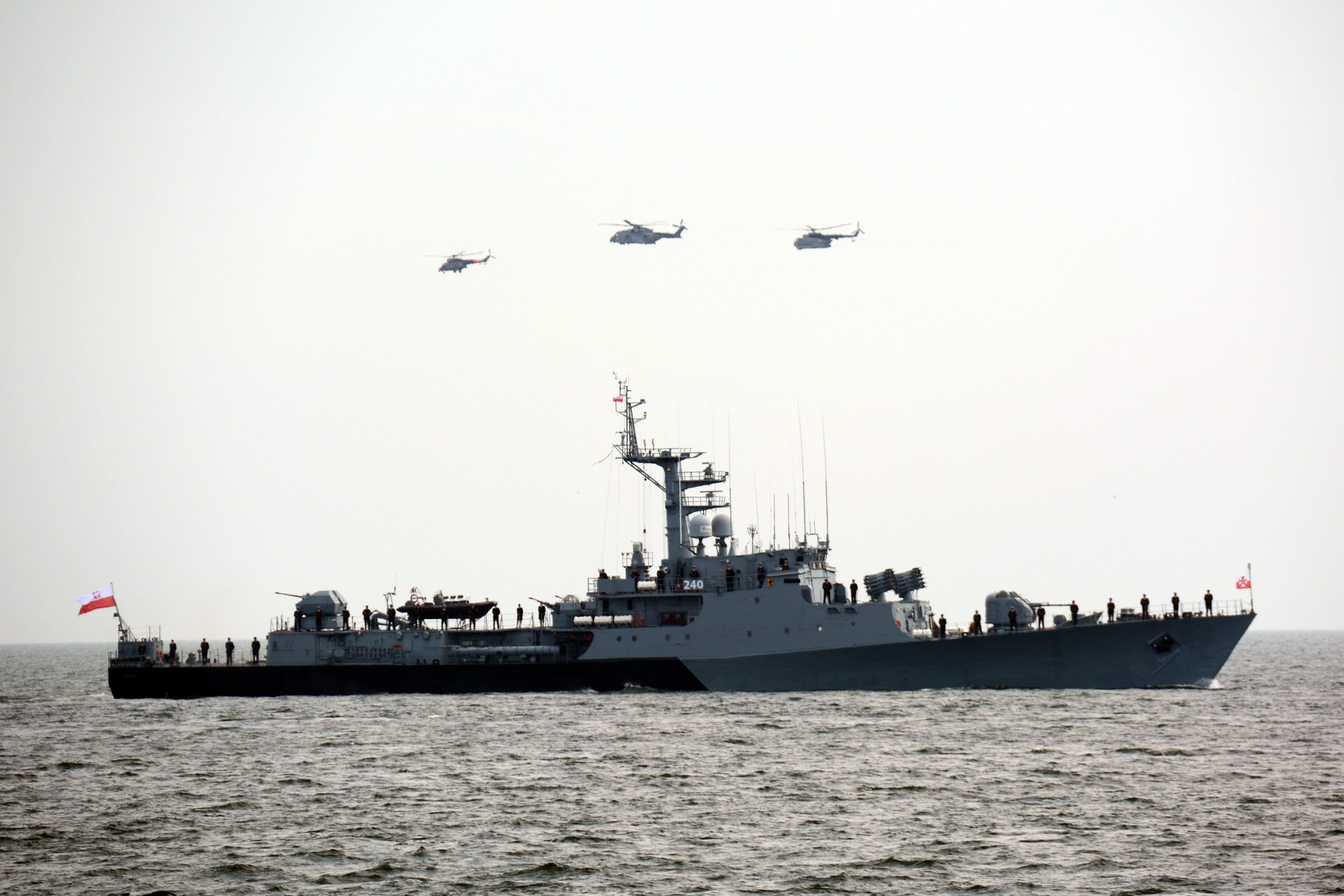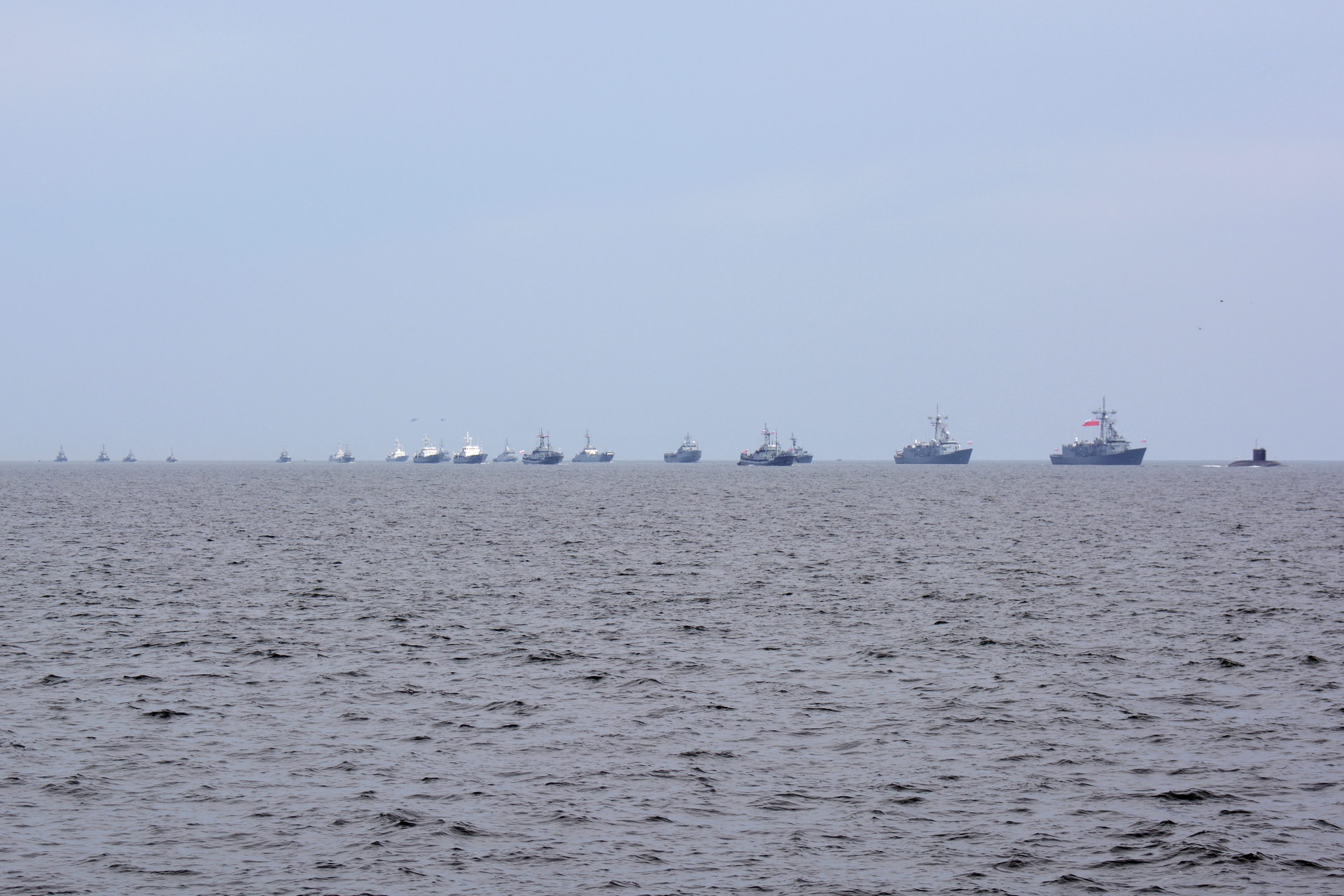 Rankiem jednostki pływające Marynarki Wojennej opuściły port wojenny w Gdyni i udały się na północ od Półwyspu Helskiego, gdzie następnie uformowały szyk składający się z dwóch kolumn. Paradę otwierał idący na czele szyku okręt podwodny ORP Orzeł (291), który znajdował się pomiędzy oboma kolumnami utworzonymi przez jednostki nawodne. Za nim podążały w lewej kolumnie: dwie fregaty typu Oliver Hazard Perry: ORP Gen. T. Kościuszko (273) oraz ORP Gen. K. Pułaski (272), korweta projektu 620D ORP Kaszub (240), okręt dowodzenia siłami obrony przeciwminowej projektu 130Z ORP Kontradmirał X. Czernicki (511), okręt transportowo-minowy projektu 767 ORP Lublin (821), dwa niszczyciele min projektu 258: ORP Albatros (602) i ORP Mewa (603) oraz dwa okręty rozpoznania radioelektronicznego projektu 863: ORP Nawigator (262) i ORP Hydrograf (263).