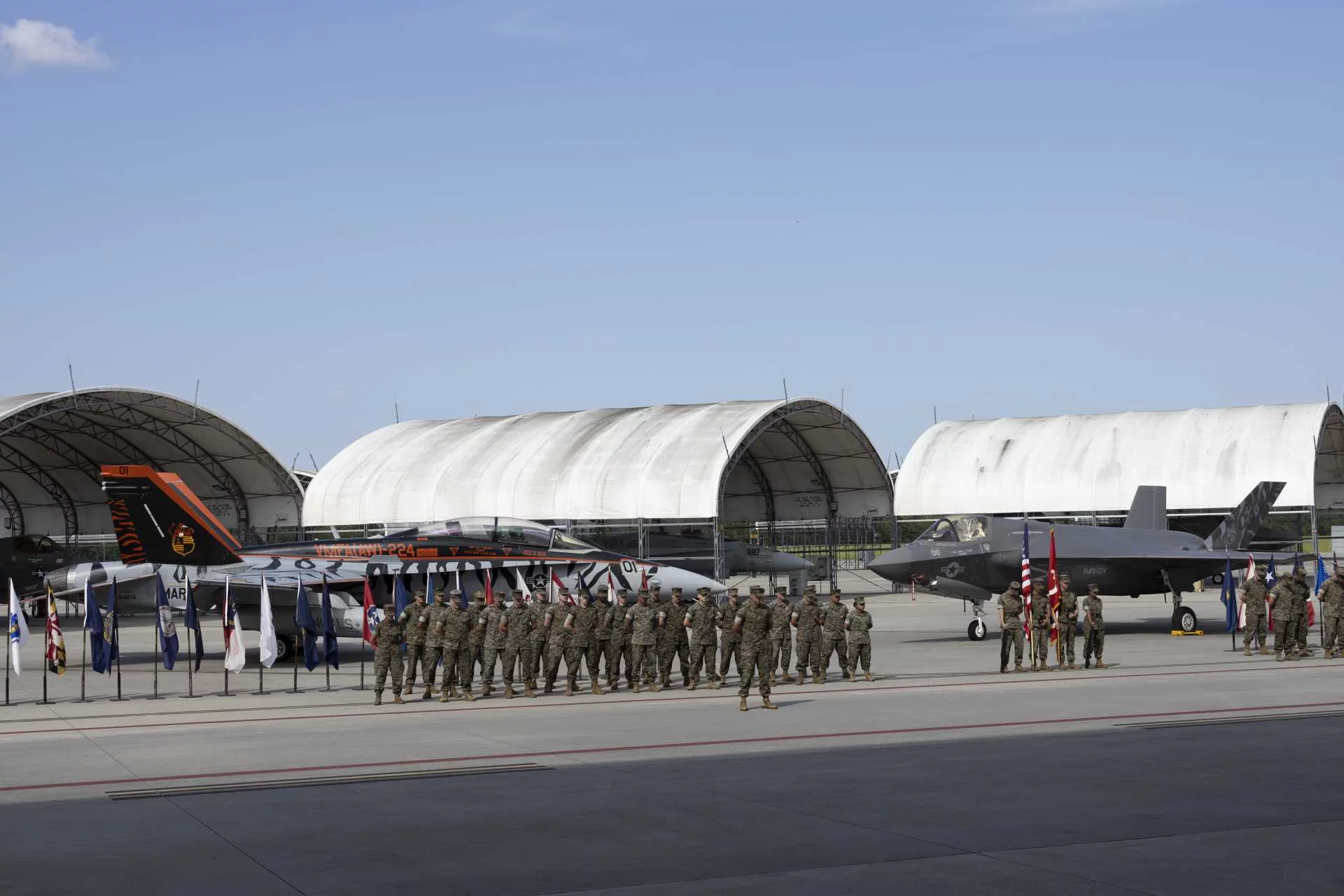Fotografia z uroczystości przekształcenia eskadry, gdzie obok widać omawiany F-35B jeszcze z częściowym nowym kamuflażem / Zdjęcie: USMC