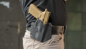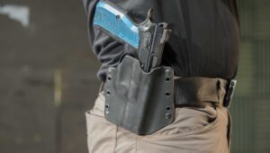 Na co dzień nosiłem w kaburze OWB full size dwa pistolety: Glocka 17 oraz SFP9 OR z kolimatorem Holosun 509T. Kabura zapinana była na dwóch rodzajach pasów: skórzanym oficerskim oraz rescue z klamrą Cobra. Na obu siedziała solidnie i się nie przesuwała. Warto zwrócić uwagę na dwa aspekty. Po pierwsze, kontur samej kabury jest wykonany w taki sposób, że część od ciała jest płytsza, a część zewnętrzna głębsza. Dzięki temu bryła mniej wystaje za obrys ciała, przewyższając klasyczne kydexowe naleśniki. Po wtóre, szlufki Phalanx Systems są profilowane. W klasycznych kydexowych wariantach, są one po prostu wygiętymi, prostymi paskami materiału. Profilowanie ułatwia wygodne i szybkie przewleczenie pasa, co na pewno docenią ludzie ceniący swój czas. Krok po kroku doszliśmy do najważniejszego pytania: jak pistolet siedzi w kaburze? Odpowiedź na nie jest prosta. Zaskakująco dobrze, choć z małym zastrzeżeniem, które dotyczy tylko konkretnych modeli broni. Dopasowanie do glocka z zamkiem o tradycyjnej szerokości jest perfekcyjne (testowane na 17,19, w kaburze compact na 34). Broń siedzi bardzo sztywno, kabura reaguje kliknięciem na włożenie. Jednym słowem ideał. W przypadku SFP9 jest bardzo podobnie, jednak nie obserwujemy już tak wyraźnego kliknięcia. Mimo to broń nie ma szans wypaść samoistnie, a w dobycie trzeba włożyć akurat tyle siły, ile należałoby oczekiwać. Warto zauważyć, że docięcie bryły umożliwia przenoszenie broni również z zamocowantm kolimatorem. Podobnie jest w przypadku innych testowanych pistoletów o magazynkach dwurzędowych. Sytuacja zmienia się nieznacznie, gdy użyjemy którejś z nowych jednorzędówek w rodzaju Glocka 48. Wtedy pistolet nadal siedzi pewnie a siła potrzebna do dobycia broni jest akceptowalna, jednak można wyczuć lekkie luzy. W naszej ocenie nie ma to jednak wpływu na bezpieczeństwo przenoszenia broni, gdyż wklęsły element kabury bardzo dobrze blokuje się na kabłąku uniemożliwiając przypadkowe wypadnięcie. Kabura pasuje również do CZ P10, CZ 75, Stike One. Niestety widoczny na zdjęciach 1911 jest już za wąski. Wygląda na to, że Phalanx rzeczywiście wyprodukował coś prawie do wszystkiego.
