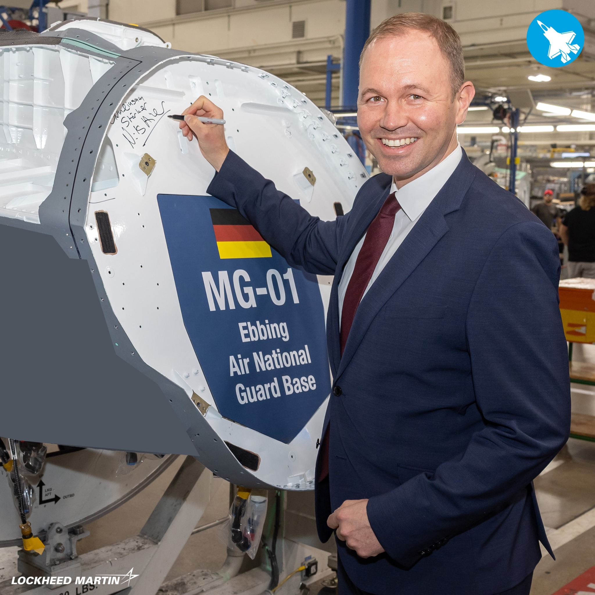German State Secretary Nils Hilmer visited @LockheedMartin Fort Worth to sign the forward fuselage bulkhead of Germany’s first F‑35A. Final assembly and inaugural flight are set for next year, delivering sovereign security and @Team_Luftwaffe's most capable fighter for NATO. pic.twitter.com/2Ck9PvUyw2