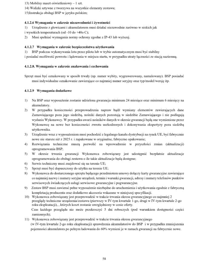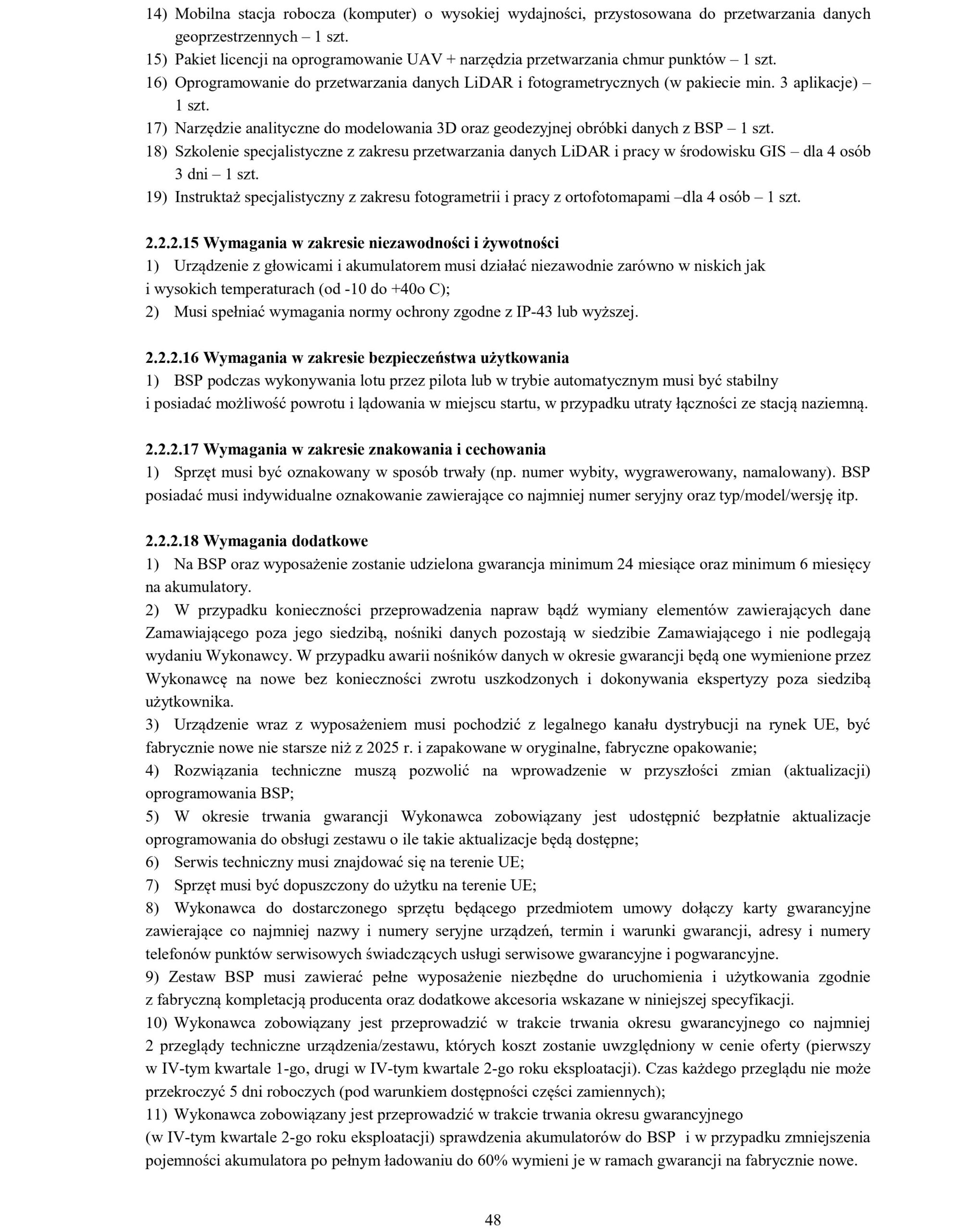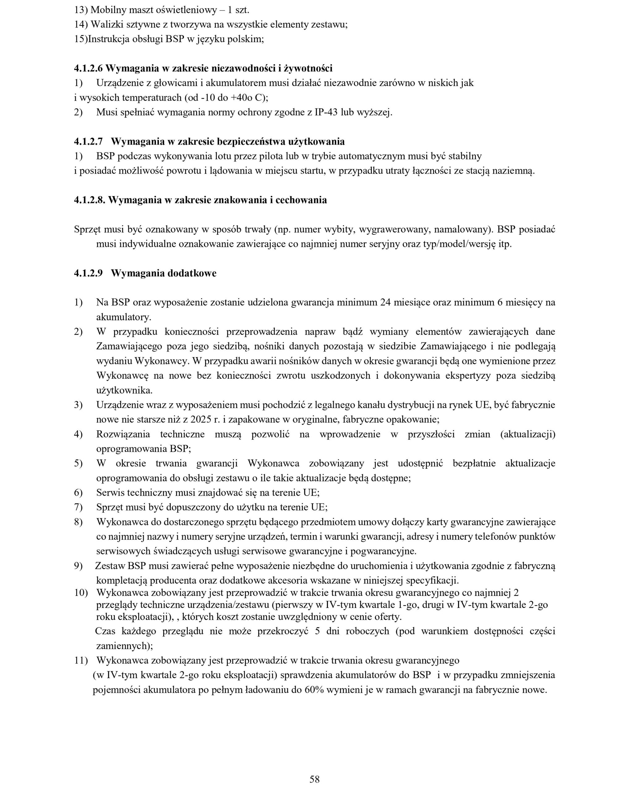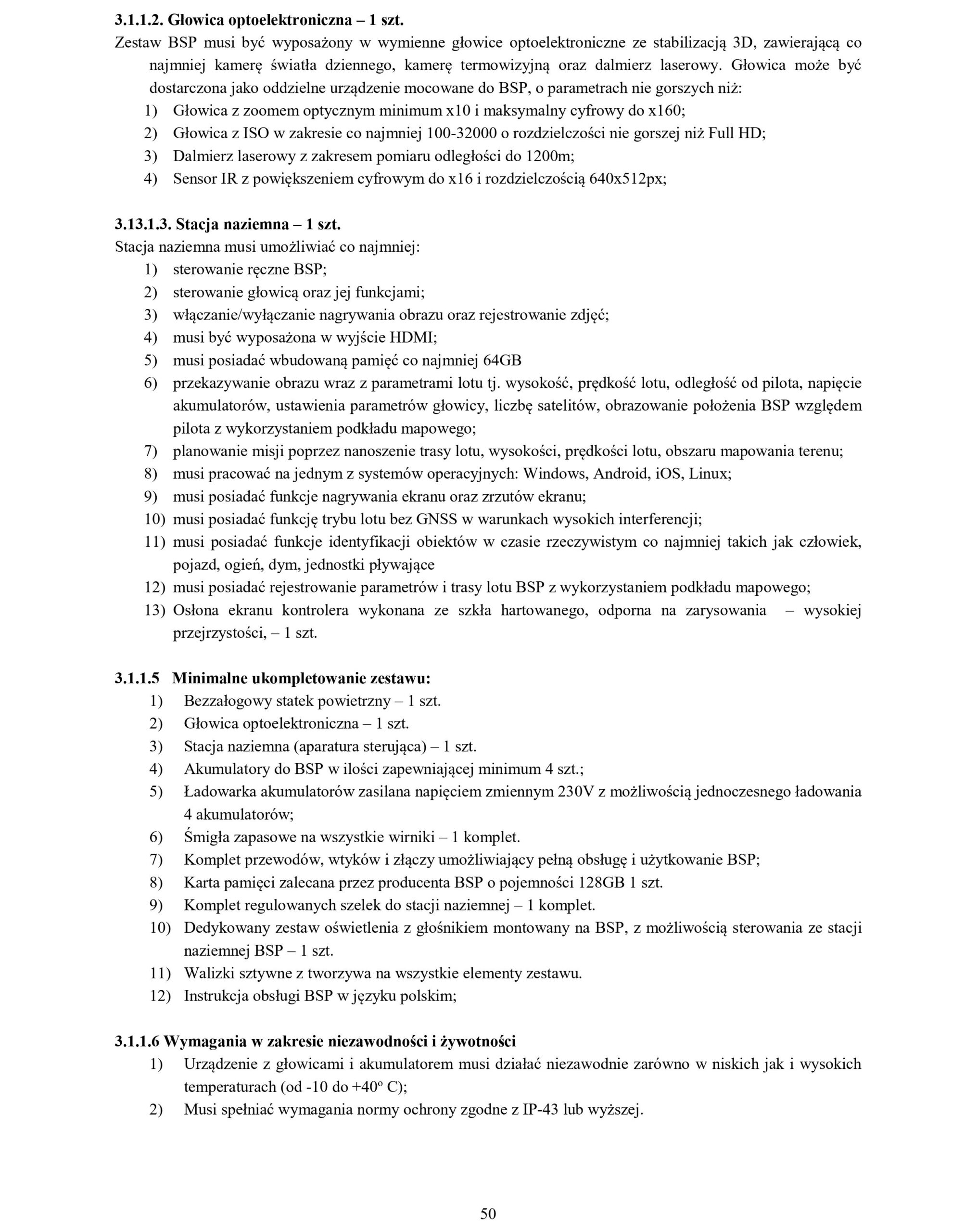 Zamawiający oczekuje realizacji zamówienia w ciągu 50 dni od daty zawarcia umowy. Ponadto, Policja żąda złożenia wraz z ofertą kart katalogowych oferowanego sprzętu i/lub inne materiały informacyjne wydane przez producenta lub szczegółowy opis oferowanego sprzętu odnoszący się do wymagań określonych w Opisie Przedmiotu Zamówienia, fotografie oferowanego produktu oraz głównych elementów składających się na całość zestawu BSP, w tym: BSP, aparatura sterująca, głowice optoelektroniczne, urządzenia obrazujące, sprzęt transportowy i pozostałe elementy zestawu, a także kopie certyfikatów Unii Europejskiej CE na oferowany produkt lub Deklaracji zgodności.