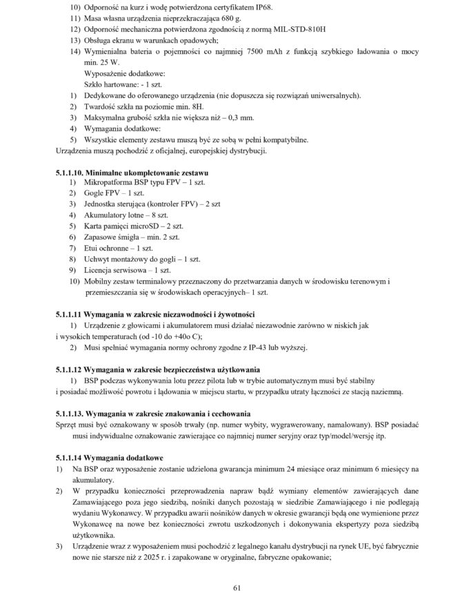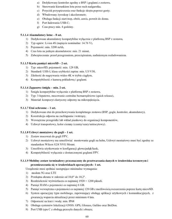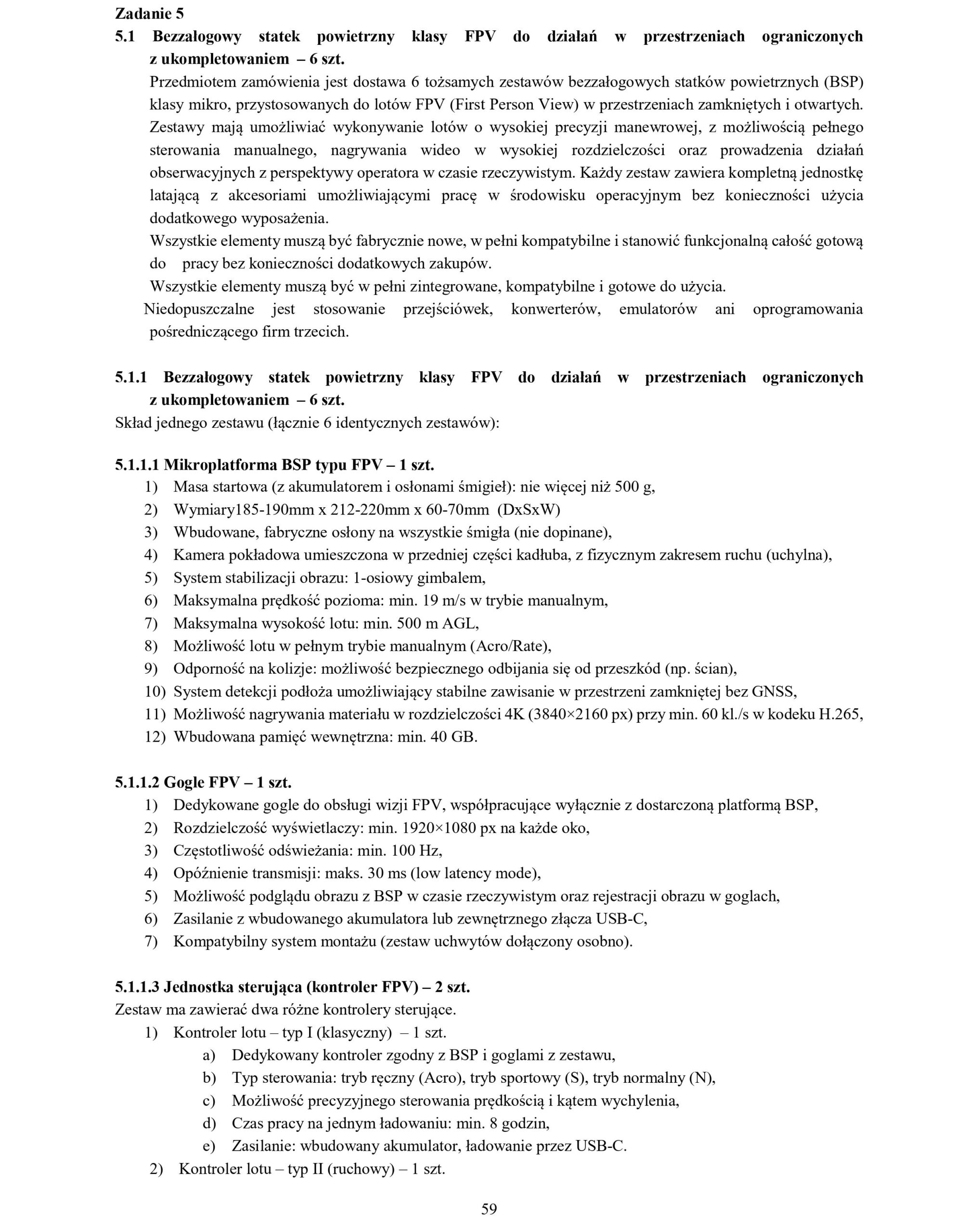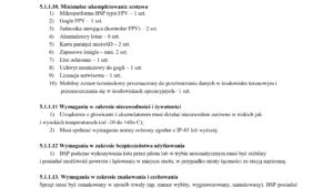 - sześciu bezzałogowych statków powietrznych klasy FPV do działań w przestrzeniach ograniczonych z ukompletowaniem.