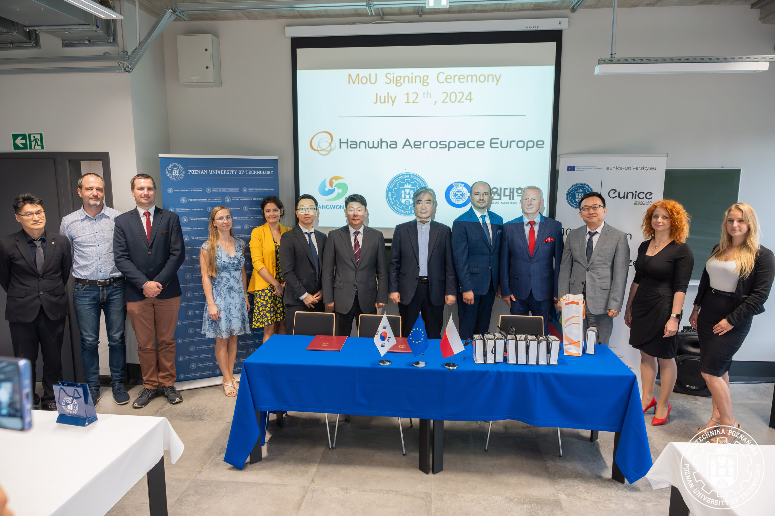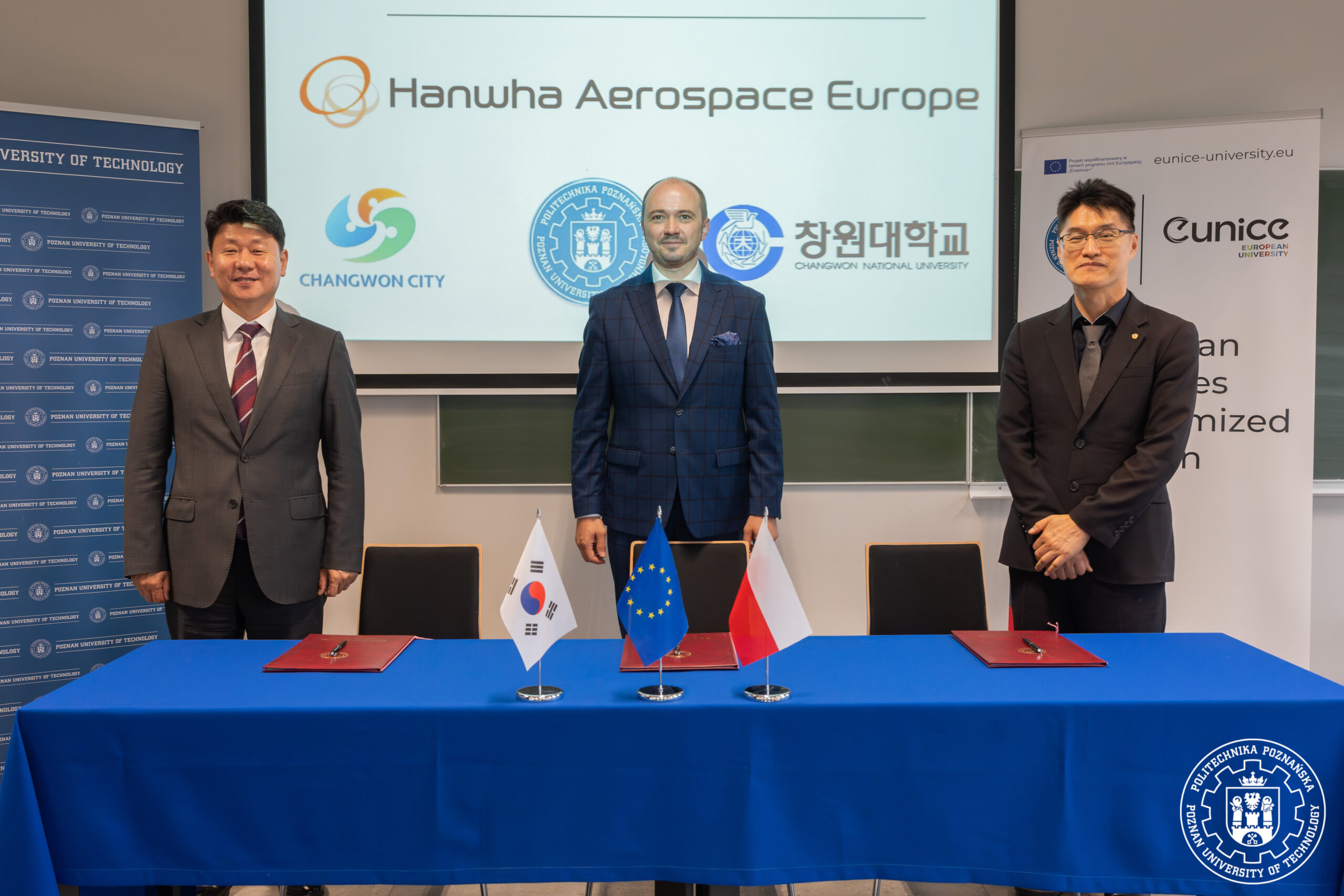 Umowa otwiera drogę do potencjalnej współpracy w zakresie badań i rozwoju technologii obronnych, kosmicznych i lotniczych, a także do wymiany doświadczeń, wymiany studentów oraz kadry pomiędzy podmiotami naukowymi. Dokument podpisał Prezes Hanwha Aerospace Europe Billy Boo Hwan Lee, Prorektor ds. Nauki Politechniki Poznańskiej prof. Wojciech Sumelka oraz Rektor Narodowego Uniwersytetu w Changwon, Min Won Park.