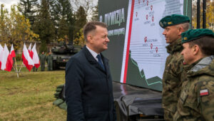 Dlaczego Nowe Miasto nad Pilicą? Otóż dlatego, że Nowe Miasto nad Pilicą ma bardzo bogate tradycje wojskowe. Przez lata, przez dekady to właśnie w tym miejscu stacjonowało Wojsko Polskie. Stacjonowały Siły Powietrzne. Potem po likwidacji tej jednostki niestety cała ta substancja uległa dewastacji, ale po 2015 r. kiedy to Prawo i Sprawiedliwość objęło rządy zaczęliśmy odbudowywać ten garnizon, tę jednostkę. Najpierw analizy dotyczyły tego, czy nie przywrócić jej charakteru właśnie bazowania Sił Powietrznych i muszę powiedzieć, że kursy z Lotniczej Akademii Wojskowej z Dęblina odbywają się w tym miejscu. Ale ze względu na budowę Centralnego Portu Komunikacyjnego doszliśmy do wniosku, że lepszą formułą będzie przeznaczenie tego garnizonu, tej lokalizacji dla Wojsk Lądowych – podkreślił minister (Powstaje 4. Batalion Piechoty Górskiej).