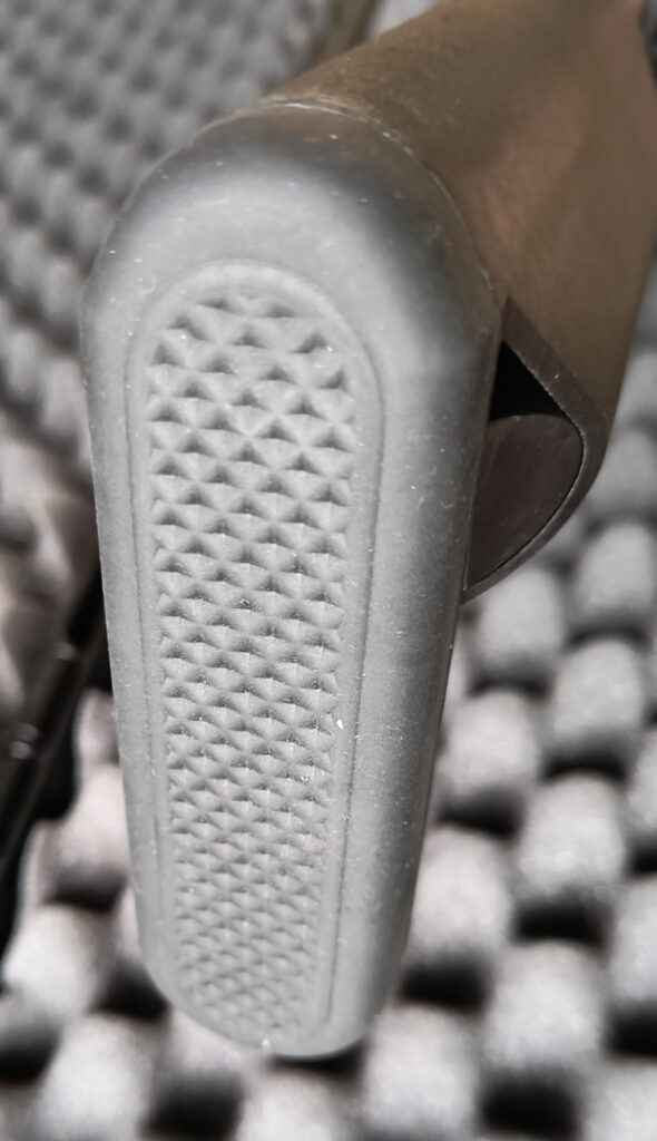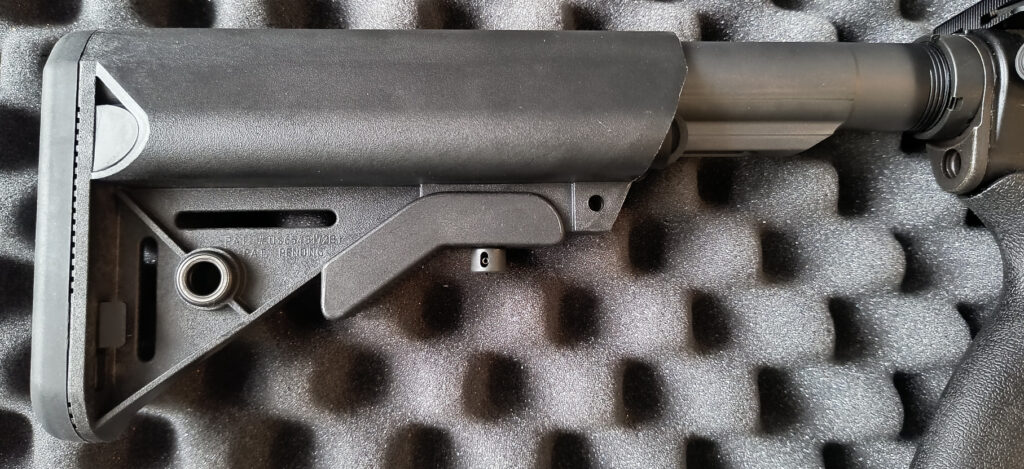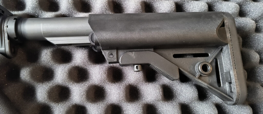 Ma ona poszerzoną część policzkową, co daje bardzo wygodne podparcie. Składanie się do strzału jest szybkie i intuicyjne po kilku próbach. Kolba jest sztywno umocowana, dopasowanie jej zajmuje sekundy, a blokowanie w chcianej pozycji odbywa się z przyjemnym i pewnym klikiem. Prosta, gumowa stopka na zwieńczeniu wygodnie opiera się o dołek strzelecki.