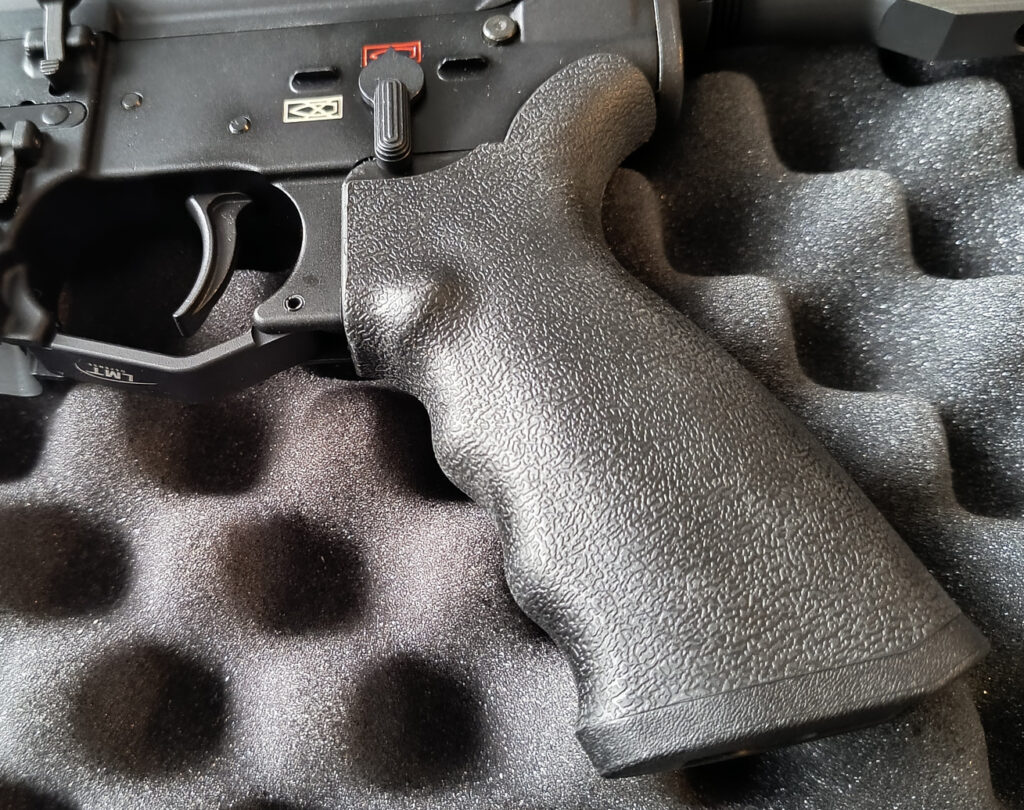 Podobnie jak kolba, chwyt pistoletowy na karabinku MARS-L również jest projektem firmy LMT. Konstrukcja inspirowana jest chwytem ERGO, który swego czasu był na wyposażeniu karabinków LMT. W aktualnie oferowanym z bronią chwycie przewidziano miejsce na moduł służący do zliczania strzałów. Po co takie ustrojstwo? Okazuje się, że był to wymóg kontraktu dla Estonii, który to ułatwić ma przeprowadzenie kontroli rusznikarskiej. Jeśli zaś chodzi o wrażenia z chwytu za chwyt LMT, to w pierwszej chwili ma się wrażenie, że ktoś wcześniej odlał kształt naszej dłoni, bo pasuje jak swój… znaczy dobrze jest zrobiony. Dobór kąta nachyleni i grubości bardzo mi odpowiadał, także nacięcia pod palce ergonomicznie zaprojektowano i rzeczywiście podpierają, a nie przeszkadzają, jak to się nieraz zdarza…Bardzo dobrze i ergonomicznie zaprojektowany projektem, że się tak wyrażę.