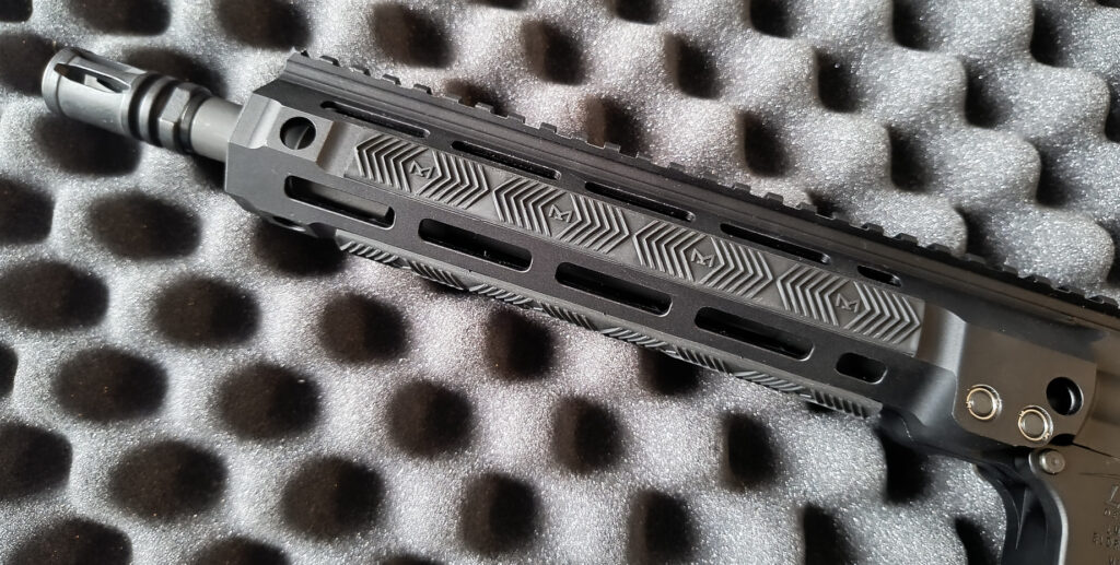 Docenić należy również zwartość całej konstrukcji, co w karabinkach typu AR takie oczywiste nie jest. Szkoda, że producent nie dodaje jakichś przyrządów mechanicznych do niego, trzeba się w system celowania zaopatrzyć samemu. Dla polepszenia chwytu dostajemy 3 panele z gumy do montażu na systemie M-LOK, które sprawdzają się bardzo dobrze.