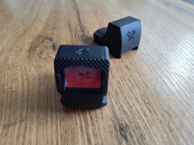 Kolimator ma duże okno, w postaci asferycznej soczewki. Obraz jest bardzo wyraźny, a samą powierzchnię pokryto natryskowo powłoką Armortek. Obudowa też robi z niego twardziela, bo to amelinium albo aluminium 7075 (na szczęście już pomalowane matowo – specjalną farbą i anodyzowane). Dodatkowo na oknie od góry znajduje się Shockshield – polimerowa wkładka z logo firmy, która ma funkcję amortyzującą przy ewentualnym niekulturalnym obchodzeniu się naszym bohaterem.