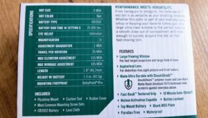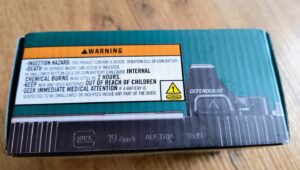 Klapka do wymiany baterii 2032 (zawartej w zestawie) jest od góry, więc nie musimy zdejmować sprzętu z broni. Dodatkowo system oszczędzania energii powoduje, że nie będziemy musieli często parać się tym procederem. Producent chwali się, że żywotność baterii to 25000 h przy jasności na poziomie 6. Tu pomocna jest funkcja automatycznego wyłączania się kolimatora po 10 minutach bezruchu. Jeśli chcemy znów mieć go w trybie pracy, wystarczy podnieść broń, a włączy się samoczynnie.