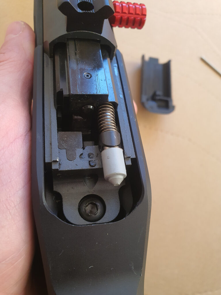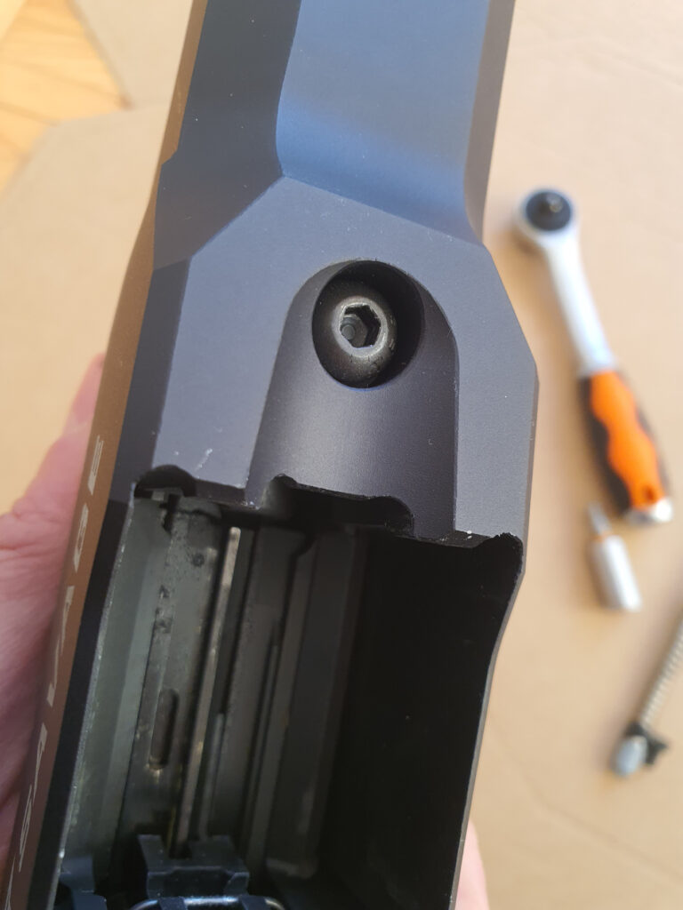 Niestety ta konstrukcja wymaga użycia klucza imbusowego do wykręcenia z osady komory zamkowej zintegrowanej z lufą. Jedna śruba umieszczona jest przed gniazdem magazynka od strony lufy, druga pod pokrywą komory zamkowej.