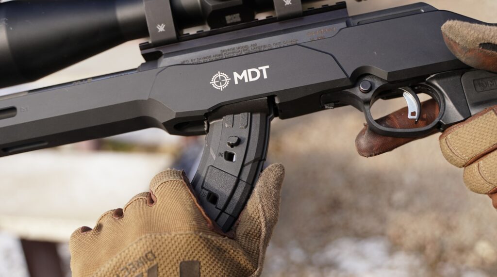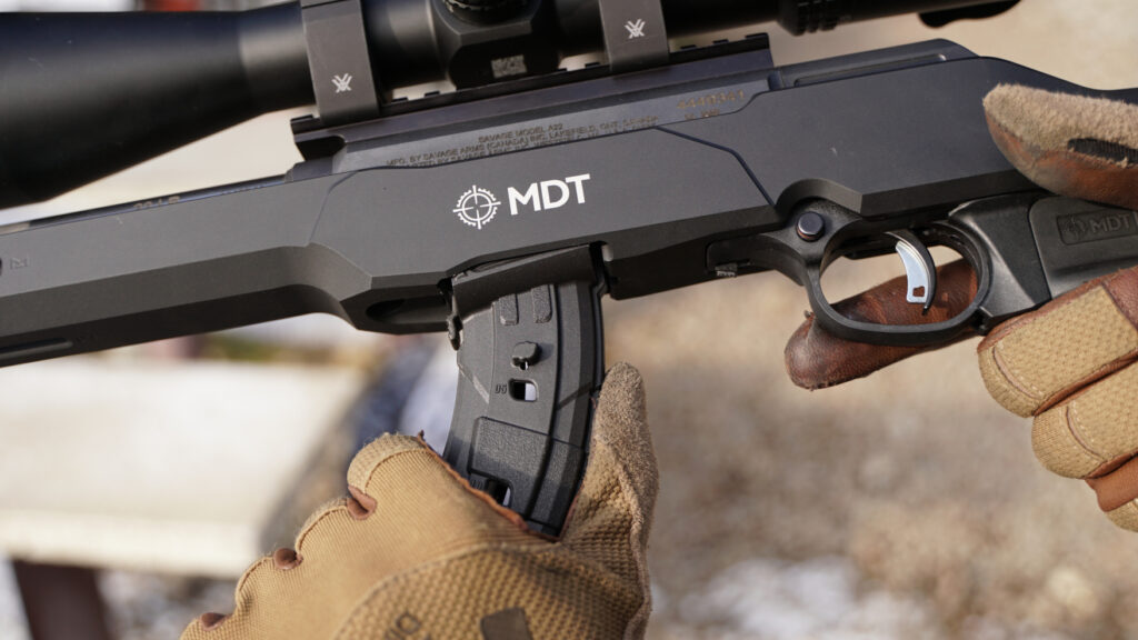 Pierwsza różnica wizualna — karabinek wygląda jak rasowy karabin snajperski, a nie zabawka. A to za sprawą nowej osady MDT wykonanej z jednego kawałka aluminium, a nie z kompozytu jak miało to miejsce w wersji A22. To rozwiązanie zapewnia nie tylko większą wytrzymałość, ale również usztywnienie całej konstrukcji. Również masa całej broni dosyć mocno podskoczyła. Savage A22 to tylko 2,5 kg – w przypadku Precision Lite waga pokazuje 3,03 kg, a w Precision aż 3,3 kg. Tak solidna osada musi jednak swoje ważyć.