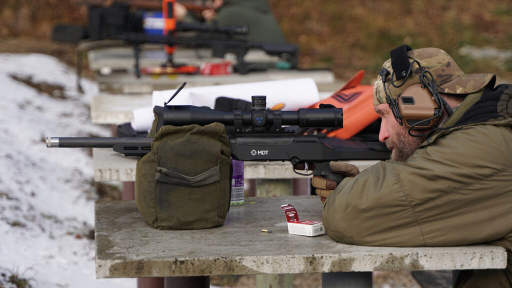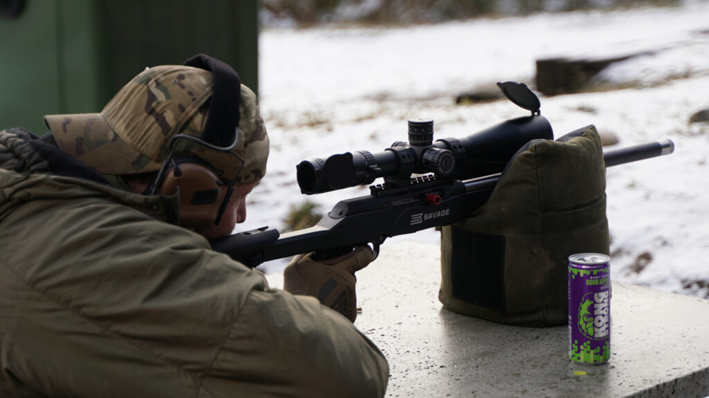Ocena celności niestety została mocno zaburzona przez warunki atmosferyczne, kiedy to przeszliśmy przez piękną słoneczną aurę poprzez podmuchy wiatru, kończąc na opadach śniegu. Wstępne przystrzelenie broni na 50 m na dwóch rodzajach amunicji dało bardzo rozbieżne wyniki. Jednakże na .22LR Varmint Express udało się zrobić zadowalającą grupę o rozmiarze 1 złotówki. Niestety na 100 m rozpoczęła się walka z naturą i każda kolejna grupa układała się w inny sposób. Przy tak lekkiej i słabej amunicji potrzeba dużo cierpliwości i doświadczenia w czytaniu warunków do oddania strzału. Jednakże cena amunicji .22LR mocno sprzyja tego typu testom i z czystą przyjemnością ładowałem kolejne magazynki. A każdy kolejny strzał to nowa przygoda 😉