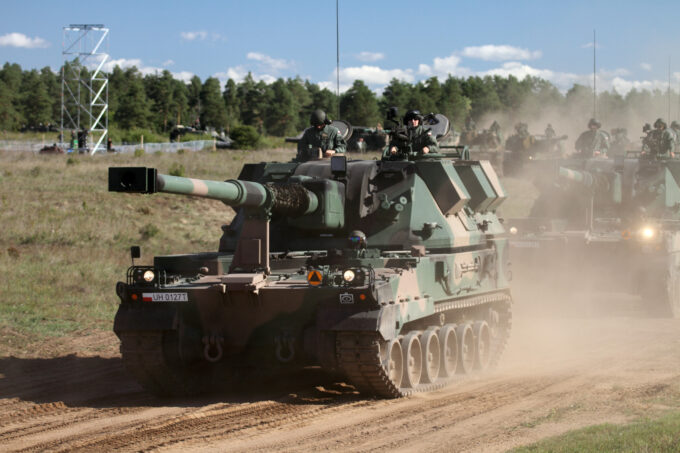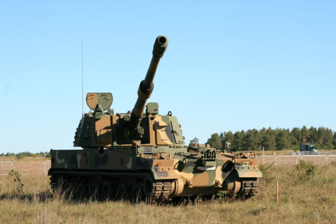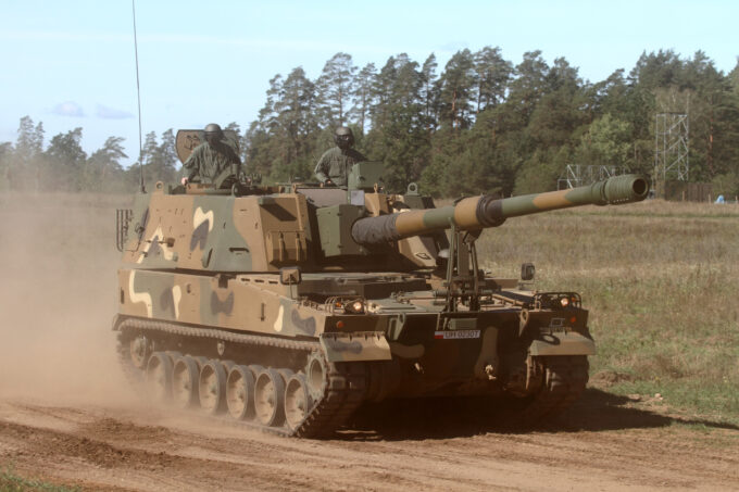 Produkowane przez Hutę Stalowa Woja haubice samobieżne Krab i koreańskie K9A1 Thunder (w głębi) na stanowiskach ogniowych