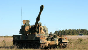 Produkowane przez Hutę Stalowa Woja haubice samobieżne Krab i koreańskie K9A1 Thunder (w głębi) na stanowiskach ogniowych
