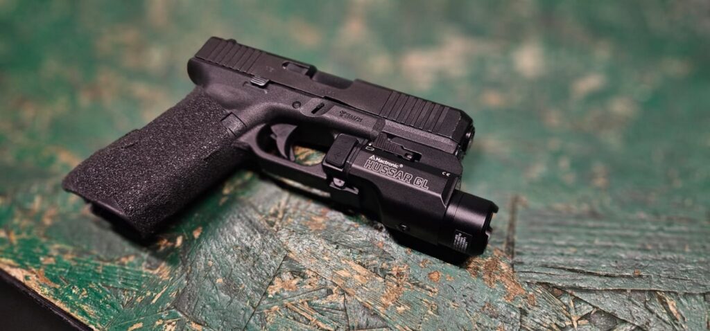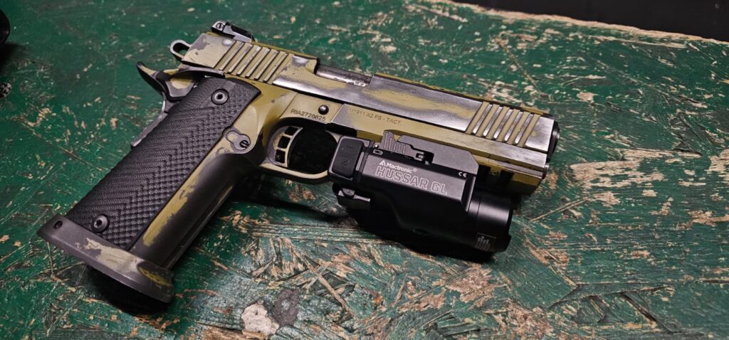Jako że latarki wydały mi się dość długie jak na broń krótką, to trzeba było zrobić rewię mody i sprawdzić, jak wyglądają na różnych typach pistoletów. Powstała z tego niezła sesja, w której udział wziął Hussar GL – obie latarki tak czy inaczej są bardzo podobne wymiarami. GL jest nieco masywniejszy z uwagi na emiter lasera, więc uznałem, że nie będę dublował fot.