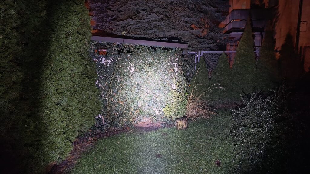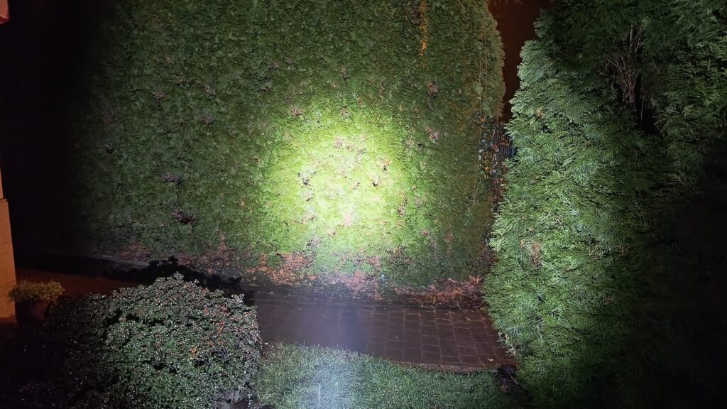 No to czas napisać, jak to czuć na broni i jak się z tym ustrojstwem strzela. Masa latarek jest odczuwalna, rozmiar widoczny, dyskusyjna jest, moim zdaniem, jako krytyka mody, estetyka takiego rozwiązania… A mimo to podobają się mnie 🙂 Ich użytkowanie jest genialne, szczególnie robotę robią włączniki. Klika się delikatnie, reagują szybko. Świecą bardzo jasno przy mocy około 1000 lumenów. Cel na pewno zauważy, że na kilkadziesiąt sekund stracił wzrok. Fakt, światło się odbija i nieco daje nam po oczach, jednak nie na tyle, żeby narzekać na swoją niedolę razem z tym, kto jest od strony emitera 🙂 Laser świeci bardzo jasno i kropka jest spokojnie widoczna na 25 m, a w przymglony dzień widać, że sięga straszliwie daleko. Co najważniejsze, punkt, na który pada zielona kropeczka, nie zmienia się. Fakt, że po zmontowaniu „poszła na trening i strzeliła” od razu 100 kulek nie wpłynął w żaden sposób na ustawienie. W przypadku tych latarek, stwierdziłem jednak, że sprawdzę i pokażę Wam jak świecą u mnie koło domu. Światło macie na „ścianę” zieleni z około 6m, czyli odległość +/- obronna – bojowa 😉