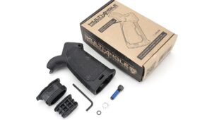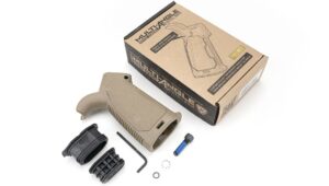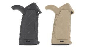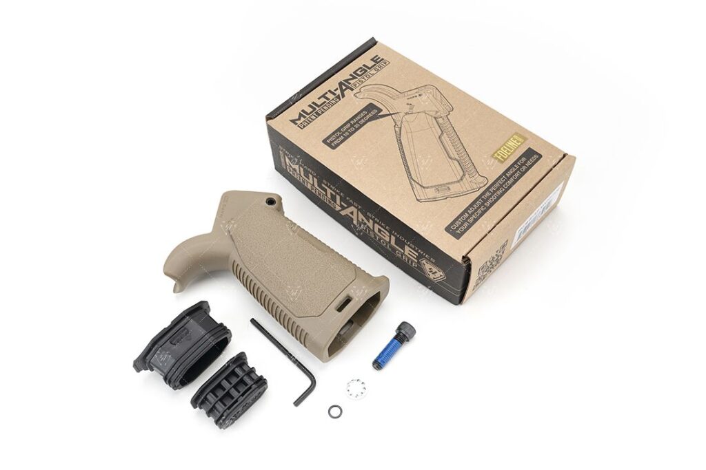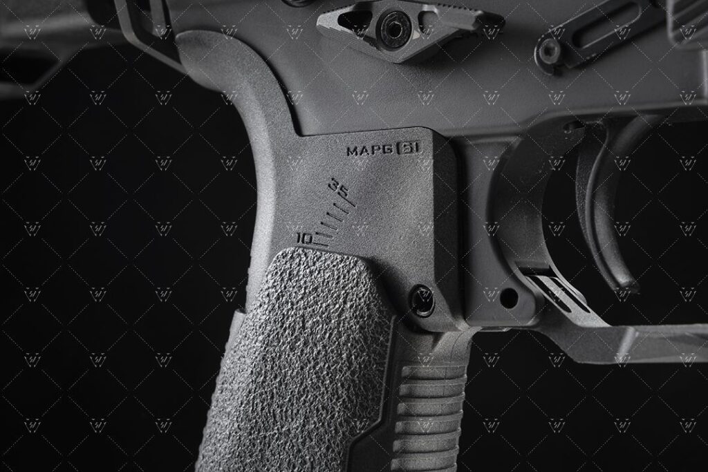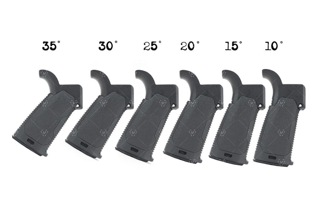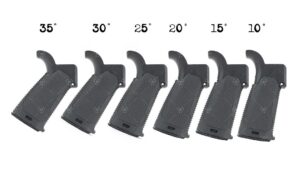 Opatentowany chwyt pistoletowy Strike Industries AR Multi-Angle Pistol Grip (MAPG) zapewnia regulację nachylenia względem pionu od 10 do 35 stopni.