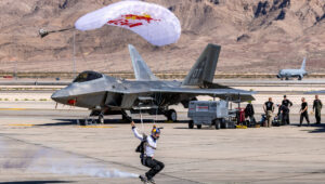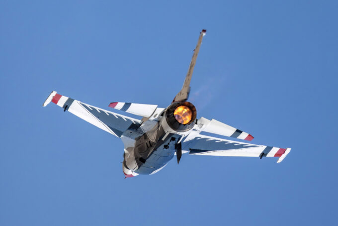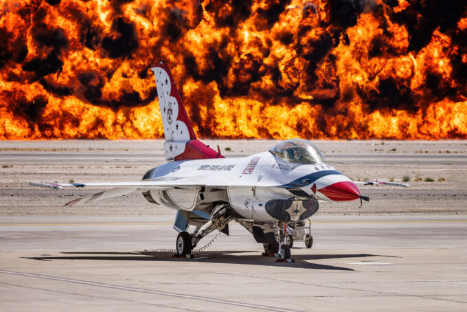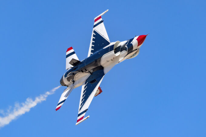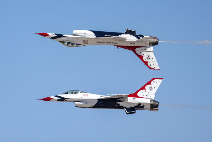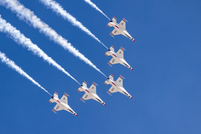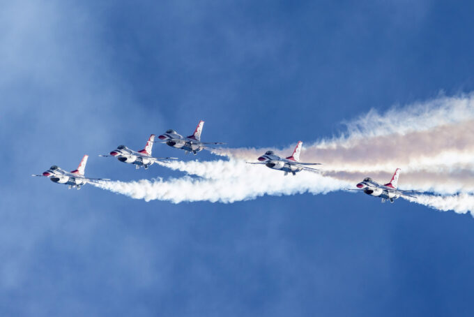 Na niebie przez cały dzień królowały maszyny o niesamowitych osiągach. Gospodarze, Thunderbirds, zaprezentowali pokaz najwyższej klasy, łącząc precyzję formacji z dynamiką manewrów na granicy możliwości fizycznych. Choć tutaj warto zaznaczyć, że formacja latała nie jak zawsze na 6 samolotów, ale tym razem widzieliśmy 5 maszyn. Aktualnie trwało szkolenie nowych pilotów, którzy nie byli jeszcze gotowi do lotów w pełnym szyku, a że były to pierwsze pokazy Thunderbirds w tym roku, zdecydowano się na pokaz w okrojonym składzie. Co wcale nie oznacza, że było gorzej, bo to co widzieliśmy na niebie było niesamowite. Nie mniej spektakularnie wypadł F-22 Raptor Demo Team, demonstrując m.in. zawisy, ostre zakręty, czy przeloty na największej dopuszczalnej prędkości.