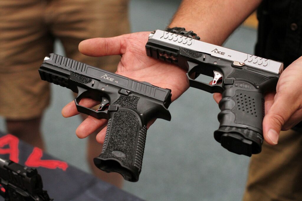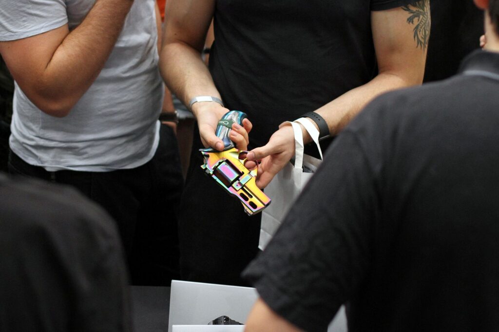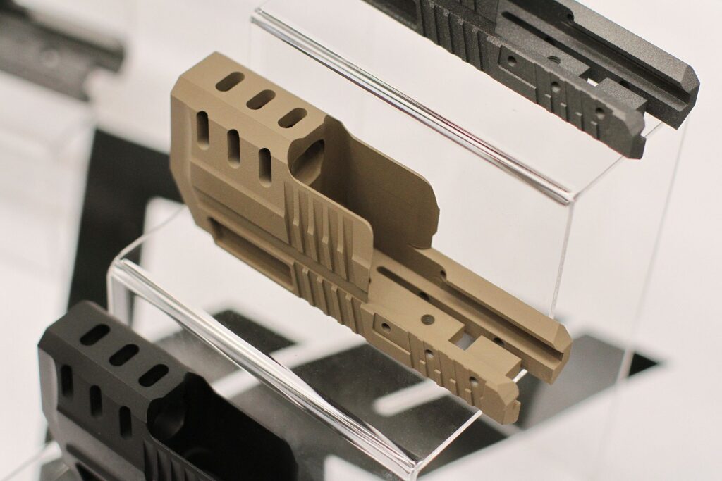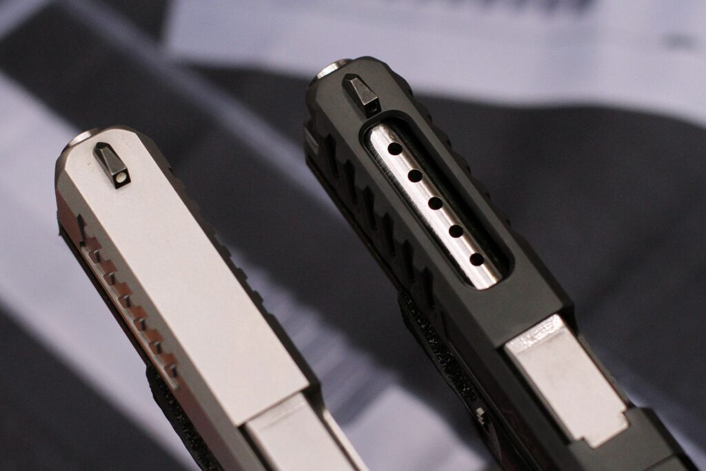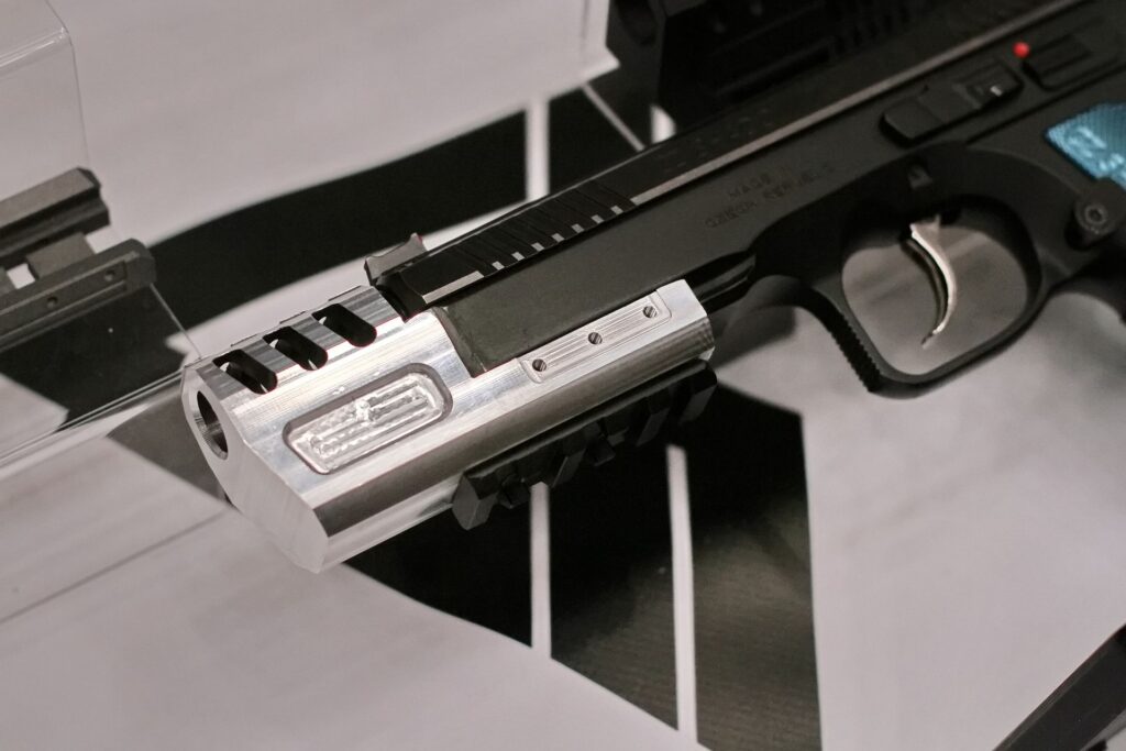 Tuż obok można było zobaczyć kompensatory firmy GK Arms. Wyróżnia je przede wszystkim konstrukcja, a w szczególności sposób montażu. Nie są bowiem przykręcane do lufy, ale montowane na szynie szkieletu – w miejscu, w którym zwykle montuje się latarkę lub celownik laserowy. Taki pomysł wymaga rzecz jasna dokładnego dopasowania kompensatora do danego modelu pistoletu, ale panowie z GK Arms obróbkę elementów metalowych mają w małym palcu. Co więcej, ich urządzenia wylotowe są dostępne w różnych wersjach kolorystycznych, czego nie omieszkali pokazać na swoim stoisku. CZ-tka, Glock, Canik – właściwie każdy pistolet z takim dodatkiem prezentował się wspaniale. A gdzie latarka? Tam, gdzie zwykle, tylko trochę niżej, ponieważ kompensatory GK Arms mają własną szynę Picatinny, aby nie odbierać nam możliwości montażu akcesoriów w tym standardzie. Ceny oscylują w granicach 1300-1600 zł.