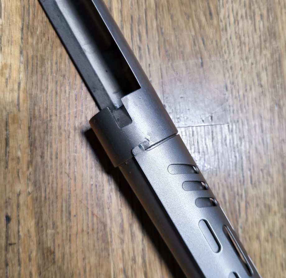 Poza celownikiem lufę wyposażono w osłonę termiczną. Tu widać oszczędności, które wbrew pozorom, są in plus dla SK-512. W przeciwieństwie bowiem do na przykład Mossberga, gdzie osłony termiczne są lutowane do lufy, tutaj perforowana blacha pełniąca tę funkcję jest przykręcana za pomocą dwóch śrub u wylotu lufy i mocowana dwoma skrzydełkami do komory zamkowej. Łatwo więc się jej pozbyć.