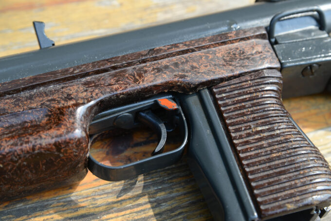 Język spustowy jest dwuchodowy – to znaczy: krótkie ściągnięcie da strzał pojedynczy, a długie to „gaz do dechy”, oczywiście w wariantach kolekcjonerskich, samoczynnych. Opanowanie oddawania strzałów pojedynczych będzie wymagało nieco czasu i… amunicji 🙂 Za językiem spustowym, przy samej komorze zamkowej znajduje się przestawny bezpiecznik – wychylenie go w lewo odbezpiecza broń. Sama zasada działania bezpiecznika polega na zablokowaniu możliwości ściągnięcia spustu przez odpowiednie ukształtowanie wycięcia w blaszce bezpiecznika.