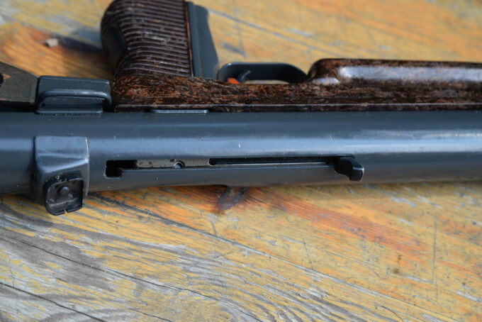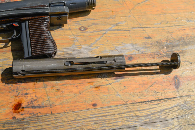 Po wyjęciu wkrętki i podkładki można swobodnie wyjąć lufę o sporej jak na „peemy” długości 284 mm. W oryginale rozwiązanie to pozwalało wymienić ją na speclufę do ślepaków, a nam pozwala na dokładne jej wyczyszczenie i kontrolę stanu przewodu. Warto wspomnieć o jednym drobiazgu, którego „peem” vz. 48 jest pozbawiony – o bagnecie. Widać bracia Czesi oparli się swego rodzaju modzie, a był to czas, w którym bagnet na „peemie” nikogo nie dziwił.