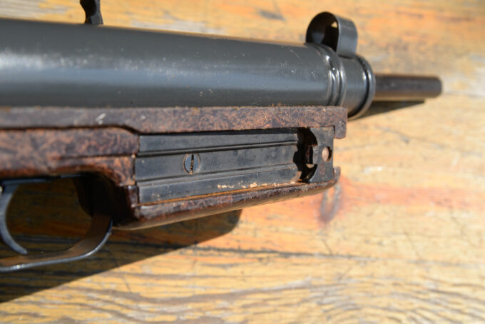 Wyjmujemy zatem magazynek. Jako że broń strzela z zamka otwartego, komora nabojowa powinna być pusta, ale nie ryzykujemy i ostrożnie opuszczamy zamek do przodu, sprawdzając obecność naboju. Gdy mamy pewność, że lufa jest pusta, możemy przystąpić do rozkładania broni.