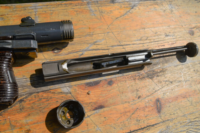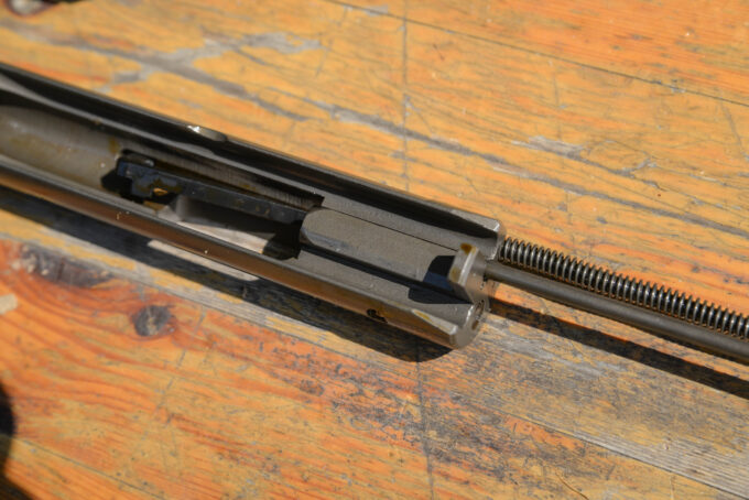 Następnie wyciągamy tarczkę z żerdzią urządzenia powrotnego. Warto obserwować rączkę zamkową – na końcu szczelina rozszerza się do rozmiarów odpowiadających rączce, a gdy rączka osiągnie ów powiększony otwór – chowa się do wnętrza zamka niczym kiosk zanurzającego się okrętu podwodnego. Dzięki temu udało się uniknąć osłabienia komory, co przy „gorącej” amunicji M48 miałoby nieciekawe skutki.