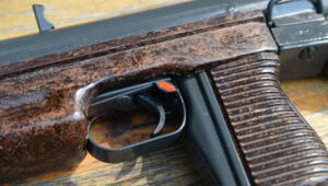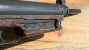 Wyjmujemy zatem magazynek. Jako że broń strzela z zamka otwartego, komora nabojowa powinna być pusta, ale nie ryzykujemy i ostrożnie opuszczamy zamek do przodu, sprawdzając obecność naboju. Gdy mamy pewność, że lufa jest pusta, możemy przystąpić do rozkładania broni.