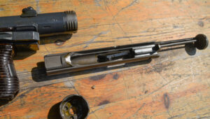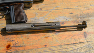 Po wyjęciu wkrętki i podkładki można swobodnie wyjąć lufę o sporej jak na „peemy” długości 284 mm. W oryginale rozwiązanie to pozwalało wymienić ją na speclufę do ślepaków, a nam pozwala na dokładne jej wyczyszczenie i kontrolę stanu przewodu. Warto wspomnieć o jednym drobiazgu, którego „peem” vz. 48 jest pozbawiony – o bagnecie. Widać bracia Czesi oparli się swego rodzaju modzie, a był to czas, w którym bagnet na „peemie” nikogo nie dziwił.