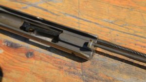 Po wyjęciu zespołu ruchomego możemy go dokładnie wyczyścić i oglądnąć. Czoło zamka znajduje się… w tylnej części, za oknem wylotowym zamka. Taka konstrukcja zamka, oprócz znacznego skrócenia całej broni, chroni strzelca w przypadku rozerwania łuski – a broń działa na zasadzie wyrzutu zamka (ang. advanced primer ignition, API). Oznacza to, że iglica zbija spłonkę PRZED całkowitym wprowadzeniem łuski do komory nabojowej. Dla mnie zawsze będzie to brzmiało trochę niebezpiecznie, ale… to działa, powodując mniejszy odrzut broni oraz bardziej „miękkie” działanie mechanizmów.