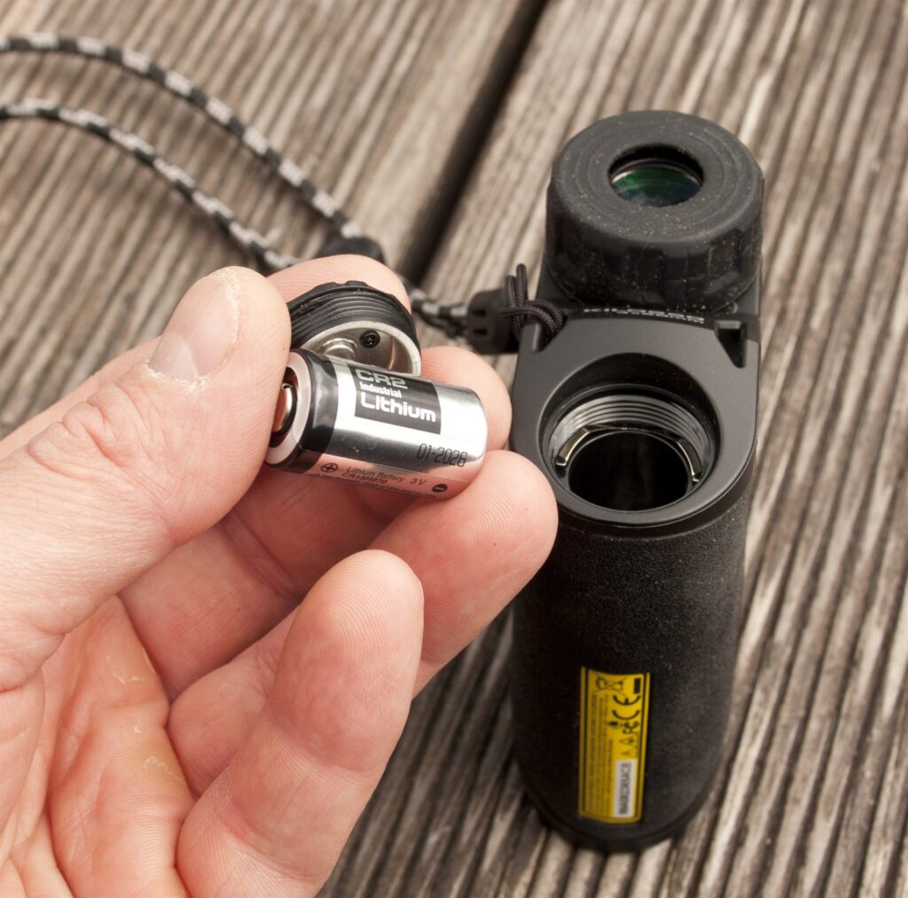 Po zdjęciu zakrętki widać przedział na małą baterię CR2. Wewnątrz dobrze widoczna naklejka z oznaczeniem biegunów.