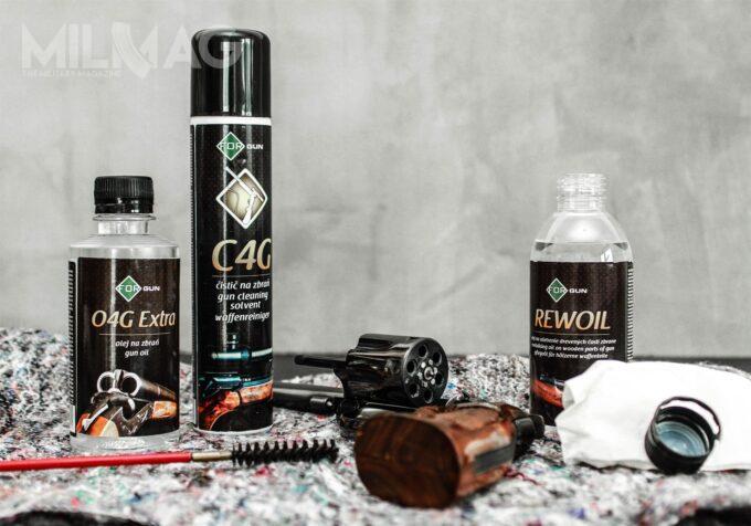 Przedstawiciele marki FOR. C4G służy do odtłuszczania powierzchni, usuwa proch, pozostałości miedzi i ołowiu jak również rdzę, tworzy suchą powłokę antykorozyjną redukującą tarcie – okazał się bezpieczny dla oksydowanych metali. Olej O4G przeznaczony jest do konserwacji i smarowania metalowych elementów broni, jego konsystencja i dołączona rurka pozwala na dotarcie do mechanizmów wewnętrznych. REWOIL do drewna wnika w jego strukturę, odświeża wygląd drewnianych części i zabezpiecza przed wodą – jest bezzapachowy