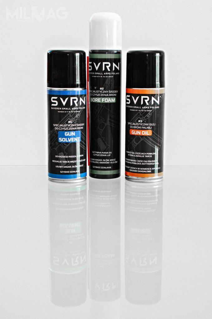 Rodzina produktów SVRN. Gun Solvent to bezwonny, wszechstronny preparat do czyszczenia każdego rodzaju broni palnej z aktywnymi środkami penetrującymi. Usuwa spracowane smary i oleje, resztki prochu, ołowiu, miedzi, sadzy, nagaru. Bore Foam – piana z dodatkiem czynnych składników do pielęgnacji przewodu lufy oraz innych elementów broni. Jest dostosowana do czyszczenia komór nabojowych wykonanych z miedzi. Smaruje i zabezpiecza, tworząc ochronny film na powierzchniach. Środek o zapachu drzewa sandałowego jest odporny na wysokie temperatury / Zdjęcie: SVRN