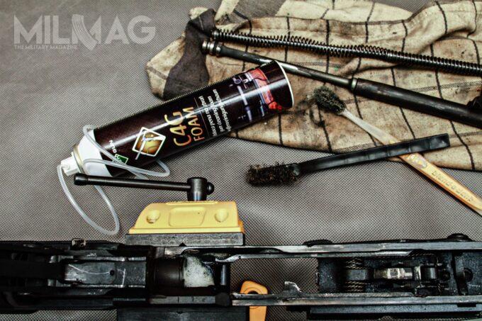 W przypadku mechanizmu spustowo-uderzeniowego na ogół czynności ograniczają się do usunięcia szczotką z długim włosiem zanieczyszczeń przylepionych na smarze lub piachu, który dostał się do środka przez okno wyrzutowe albo gniazdo magazynka. Aby dotrzeć do głębszych zakamarków mechanizmu, można posłużyć się pędzelkiem, a jeśli to nie rozwiąże problemu, użyjmy sprężonego powietrza. Przy pielęgnacji szkieletu broni, kolby, okładzin, chwytów miejmy na uwadze fakt, że nie wszystkie środki nadają się do wszystkich materiałów. Dobierzmy go właściwe do budulca.